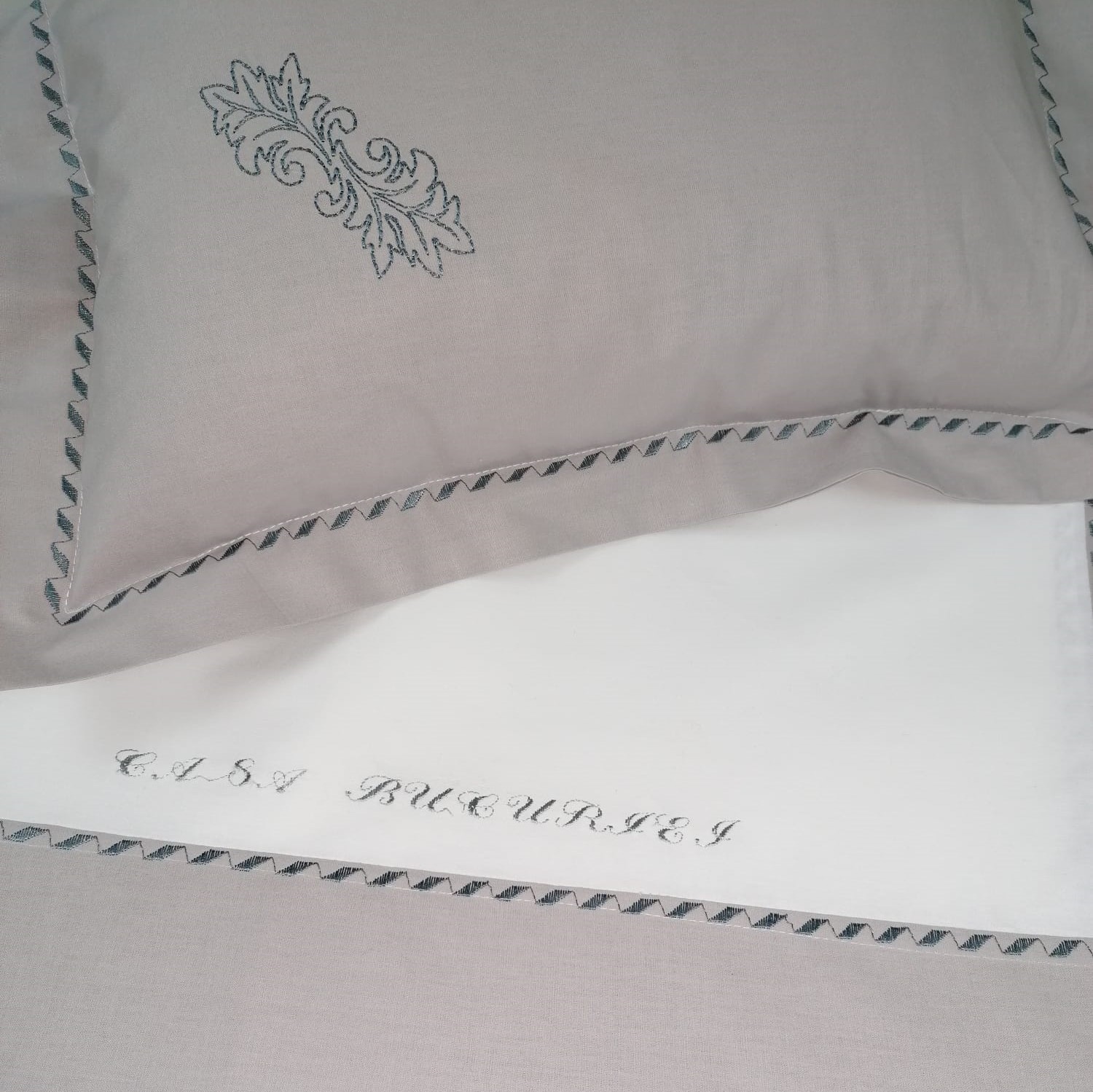 Culoare: alb( partea superioara)/gri deschis( partile laterale)/gri antracit(chenarul cu broderie)