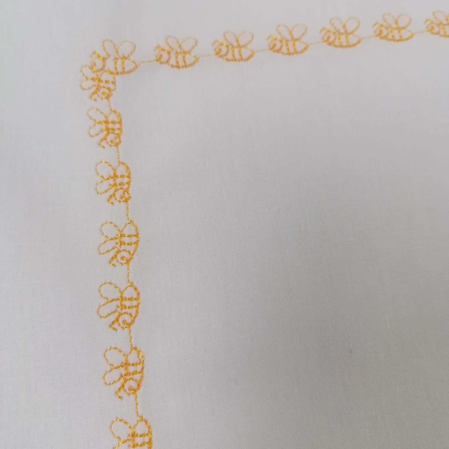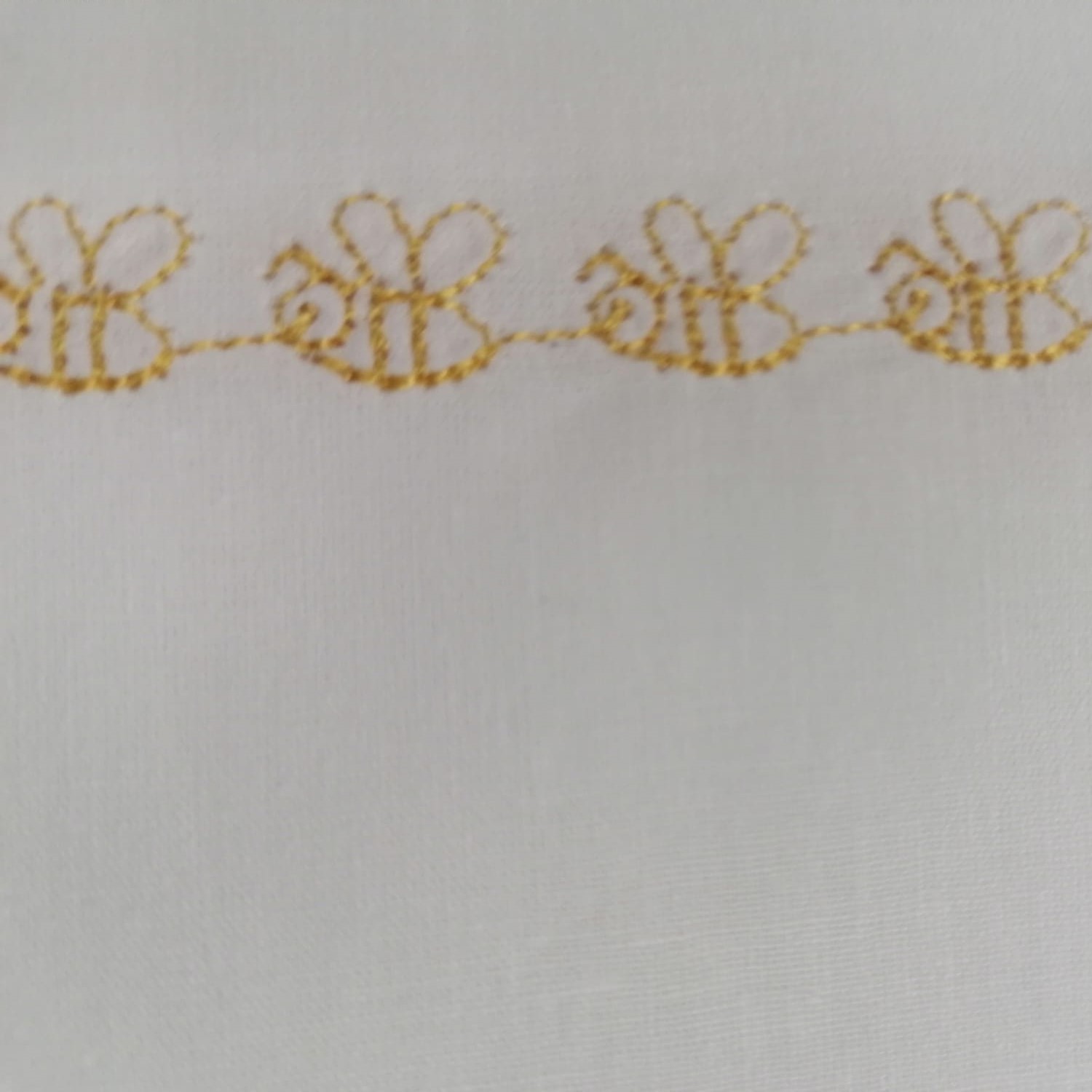 Cearsaf cu elastic pentru pat copii 80 x 160 x 15 cm, Casa Bucuriei, model albinute, alb/bej auriu, bumbac 100%, 120 cm x 200 cm, chenar brodat
