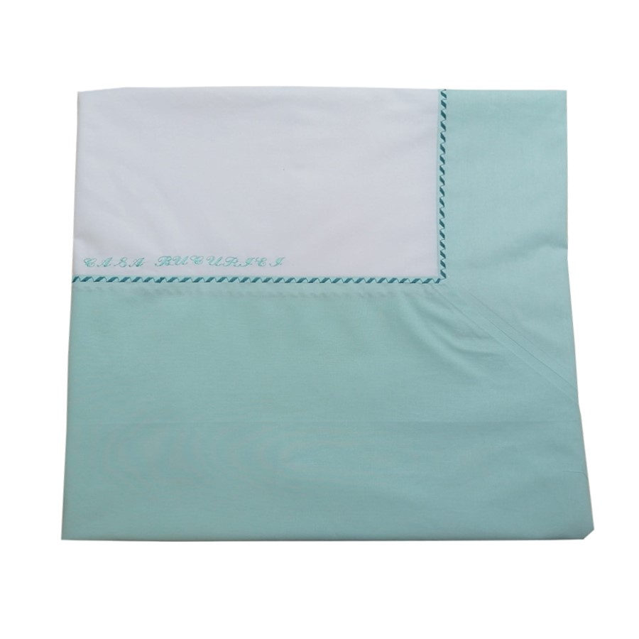 Cearsaf pat 280 cm x 280 cm, Casa Bucuriei, model Elegance, alb/turcoaz, bumbac natural 100%