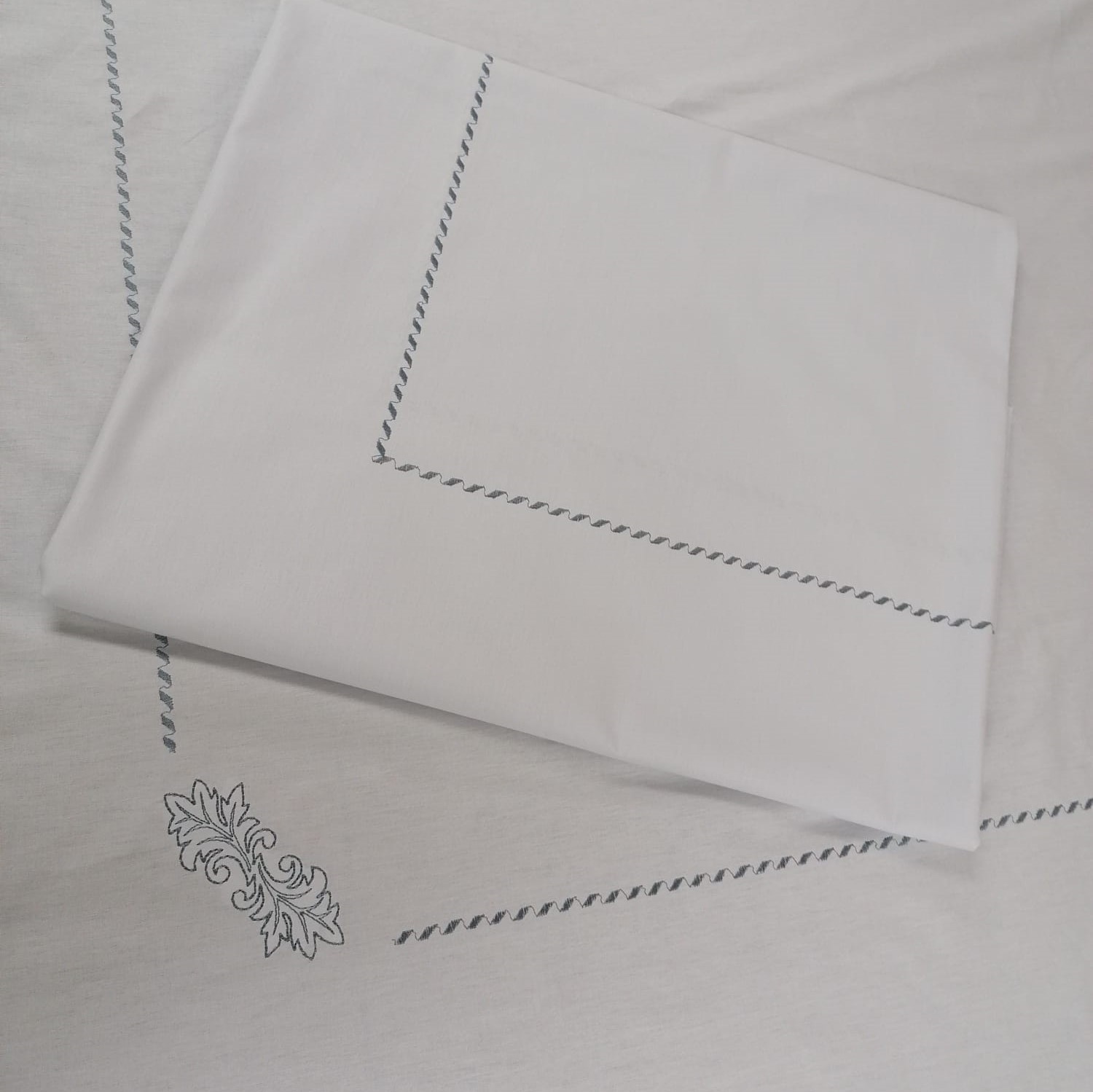 Culoare cearsaf: gri deschis si chenarul cu ata de broderie nuanta gri inchis.