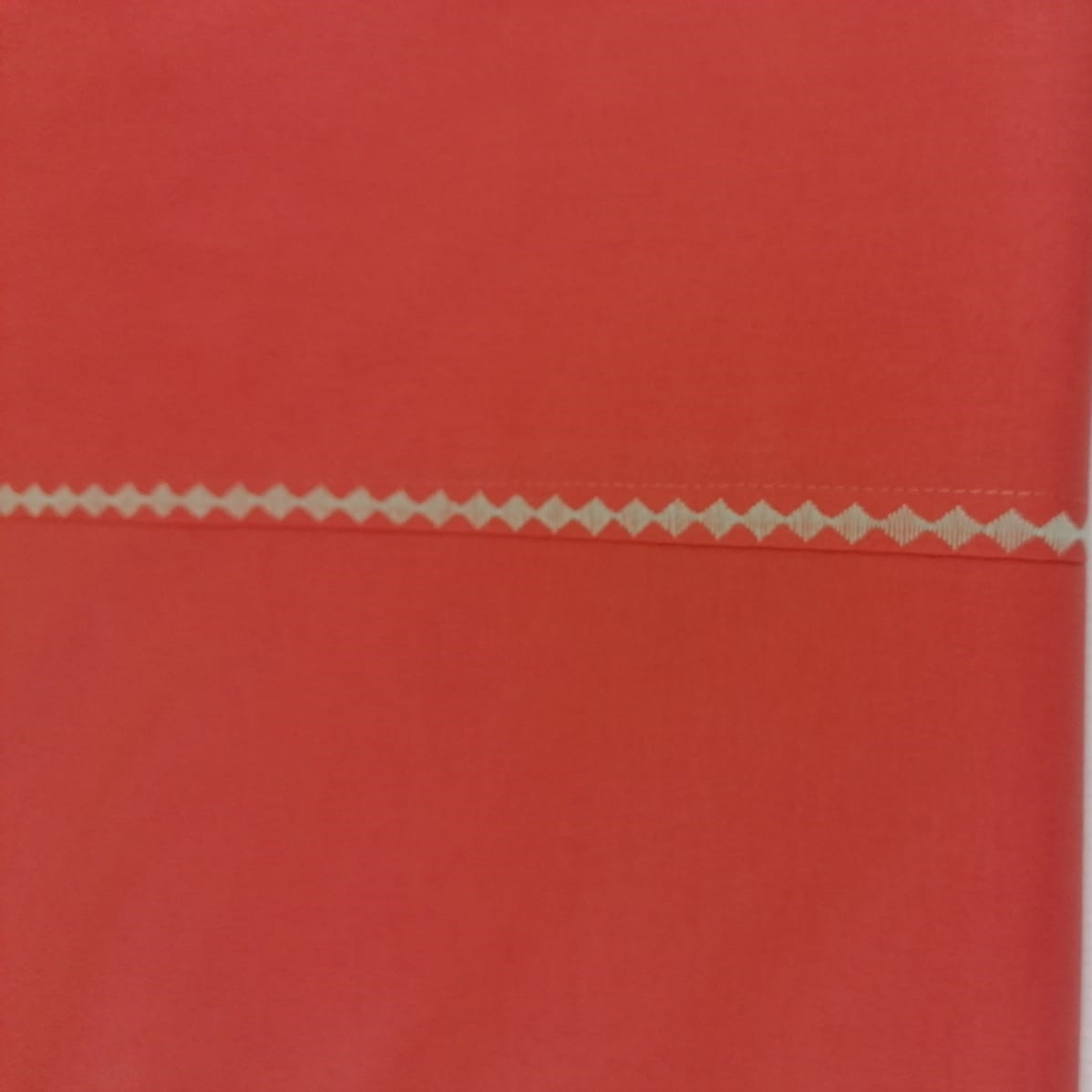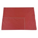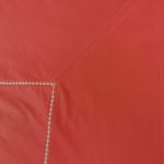 Cearsaf de pat extra large, cu dimensiuni generoase, din bumbac satinat , care pote fi combinat usor cu alte seturi de lenjerii; culoarea cearsafului este rosu coral, iar bordurile decorative sunt realizate cu ata de broderie de culoare bej deschis.