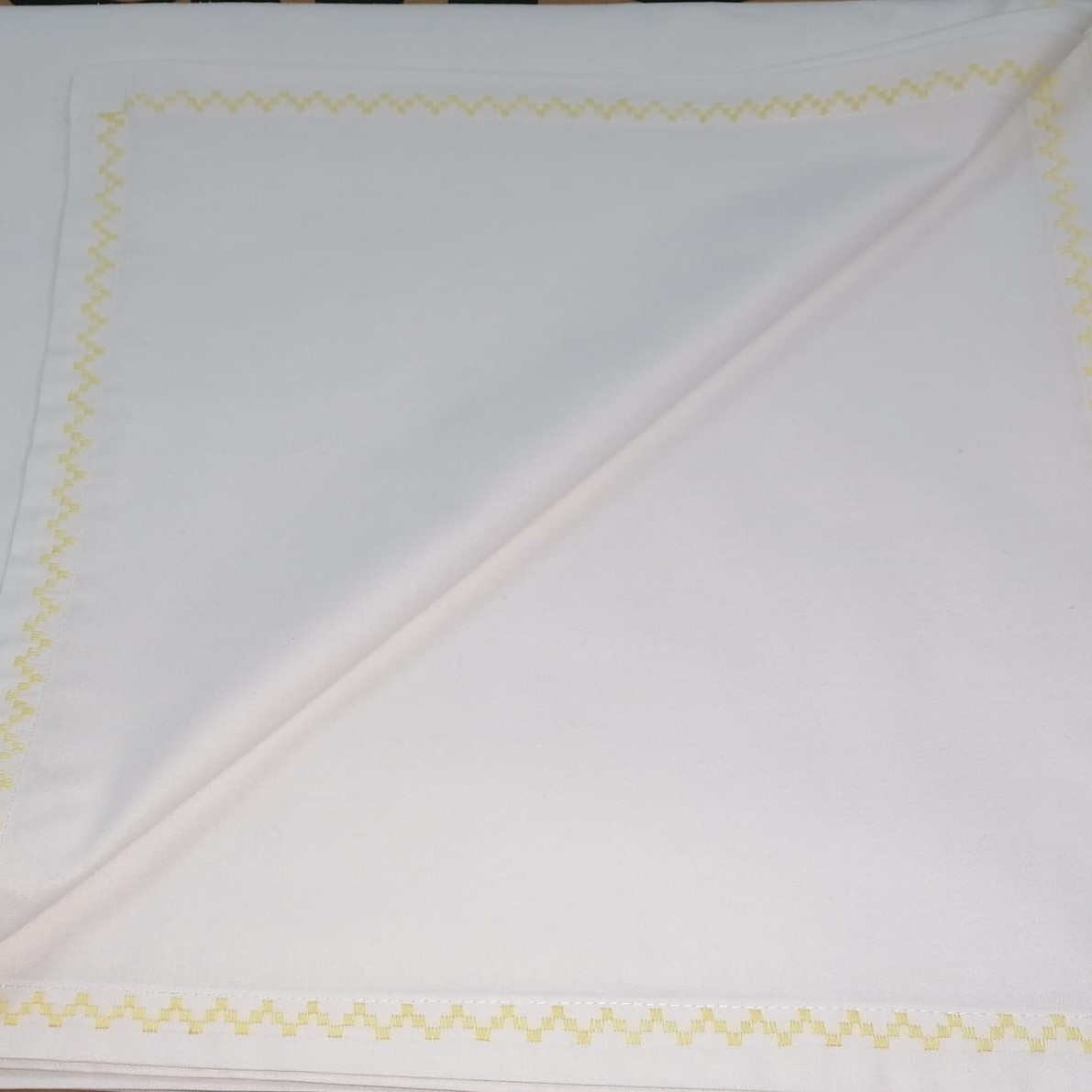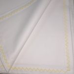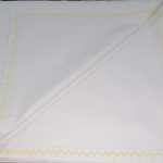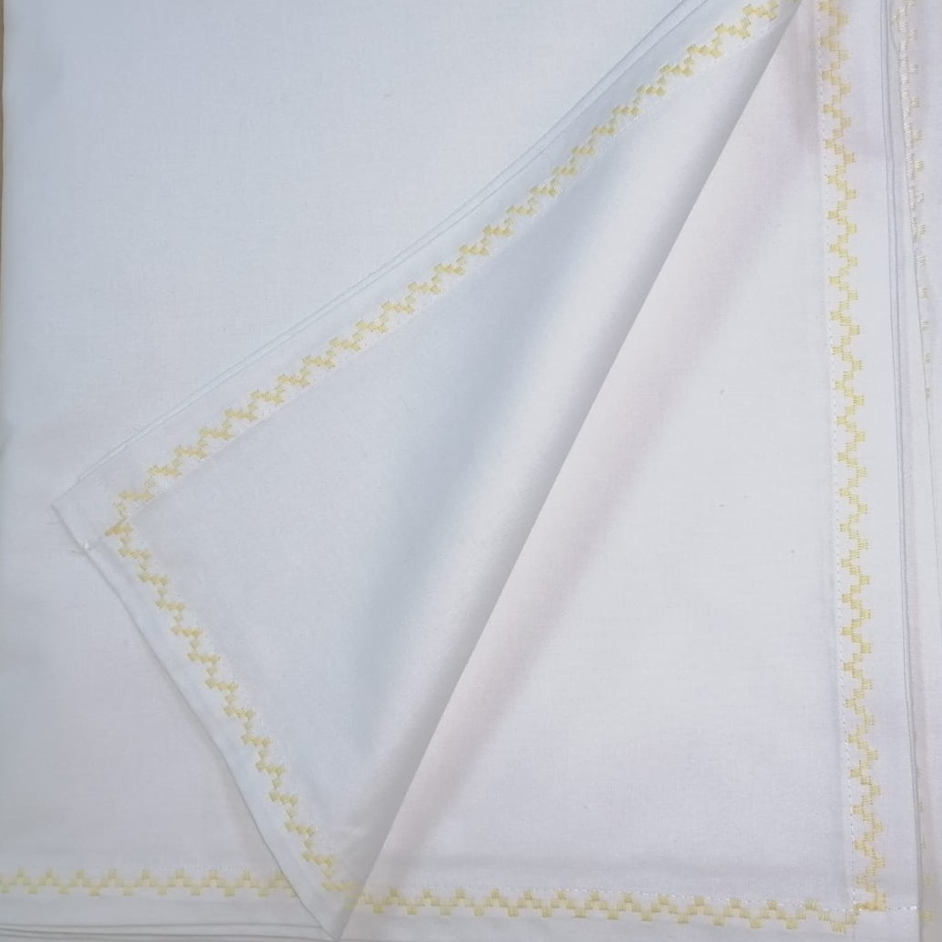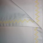 Cearsaf de pat, cu dimensiuni generoase, 300 cm x 280 cm din bumbac satinat alb, care pote fi combinat usor cu alte seturi de lenjerii; finisaj cusatura decorativa in culoarea galben.
