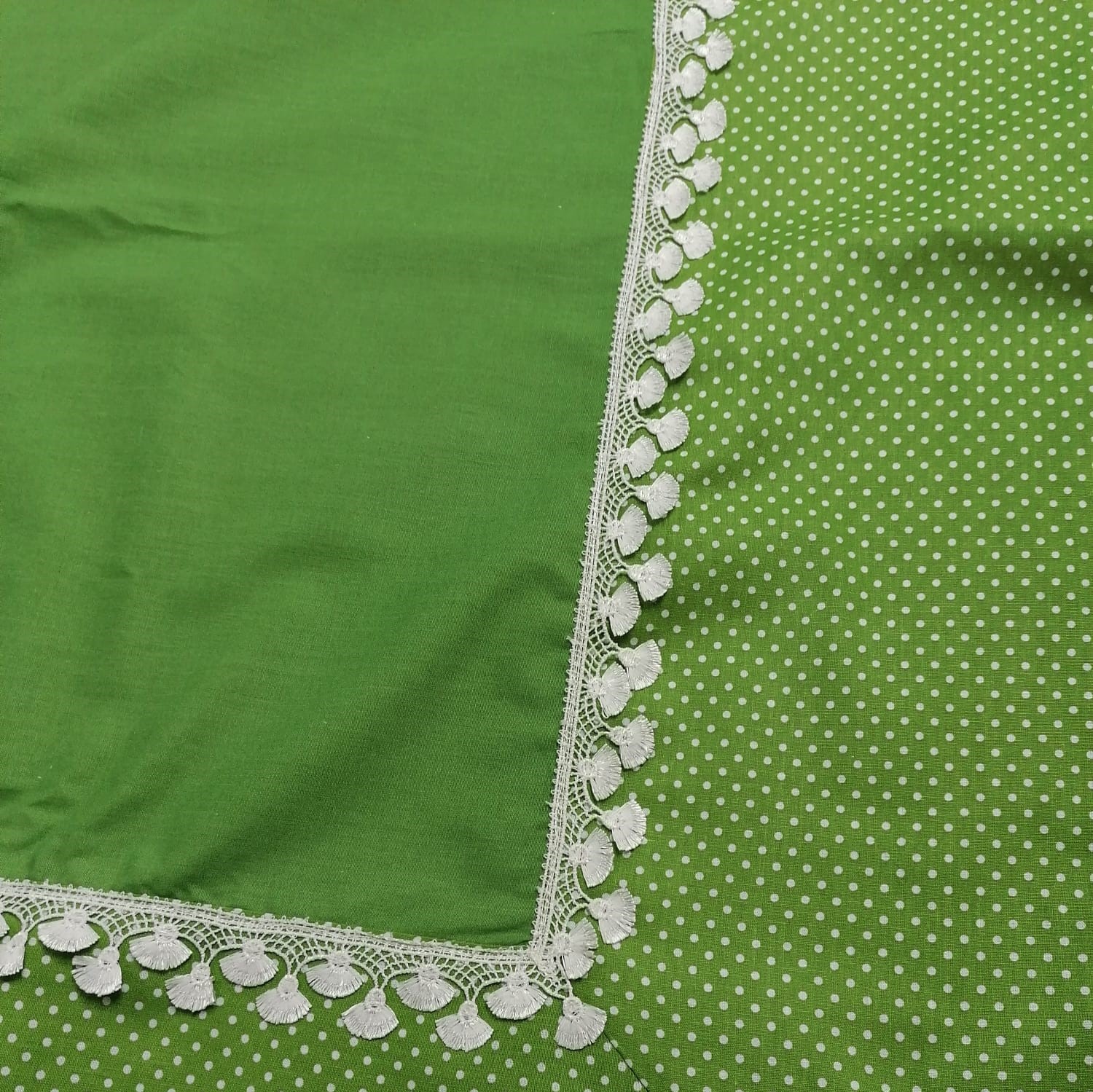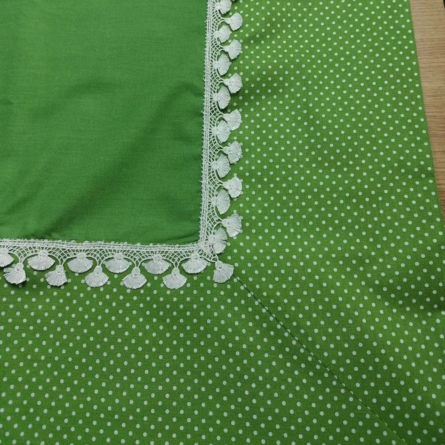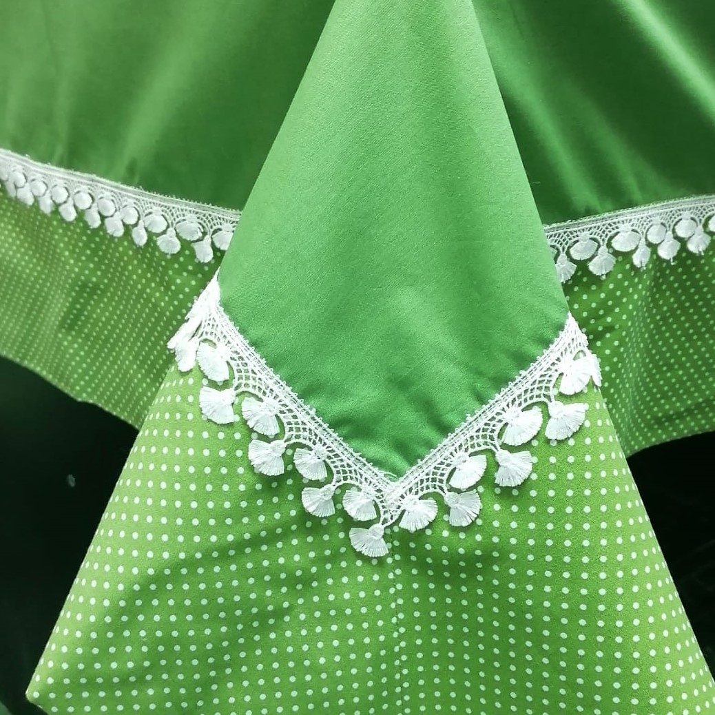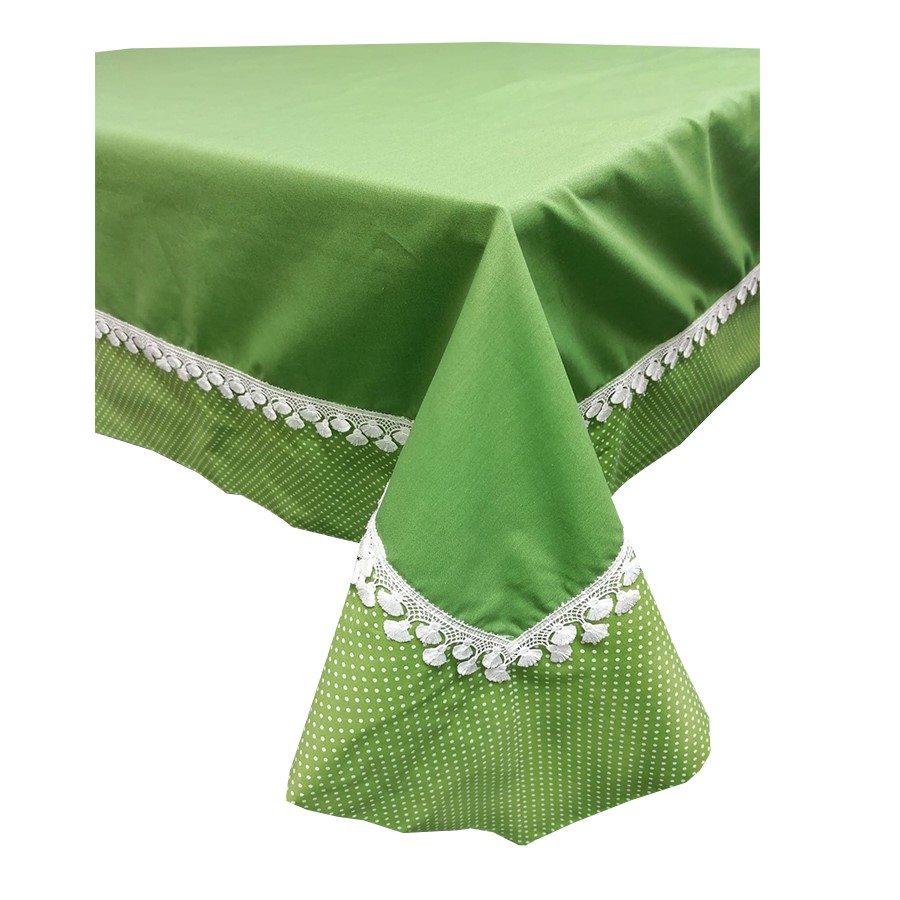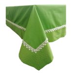 Fata de masa din gama Design, confectionata din material textile de calitate, bumbac 100%, cu un finisaj uni cu bordura si dantela aplicate, va da un aer aparte intregii incaperi, intregind bucuria si buna dispozitie specifice petrecerilor sau reuniunilor in familie.