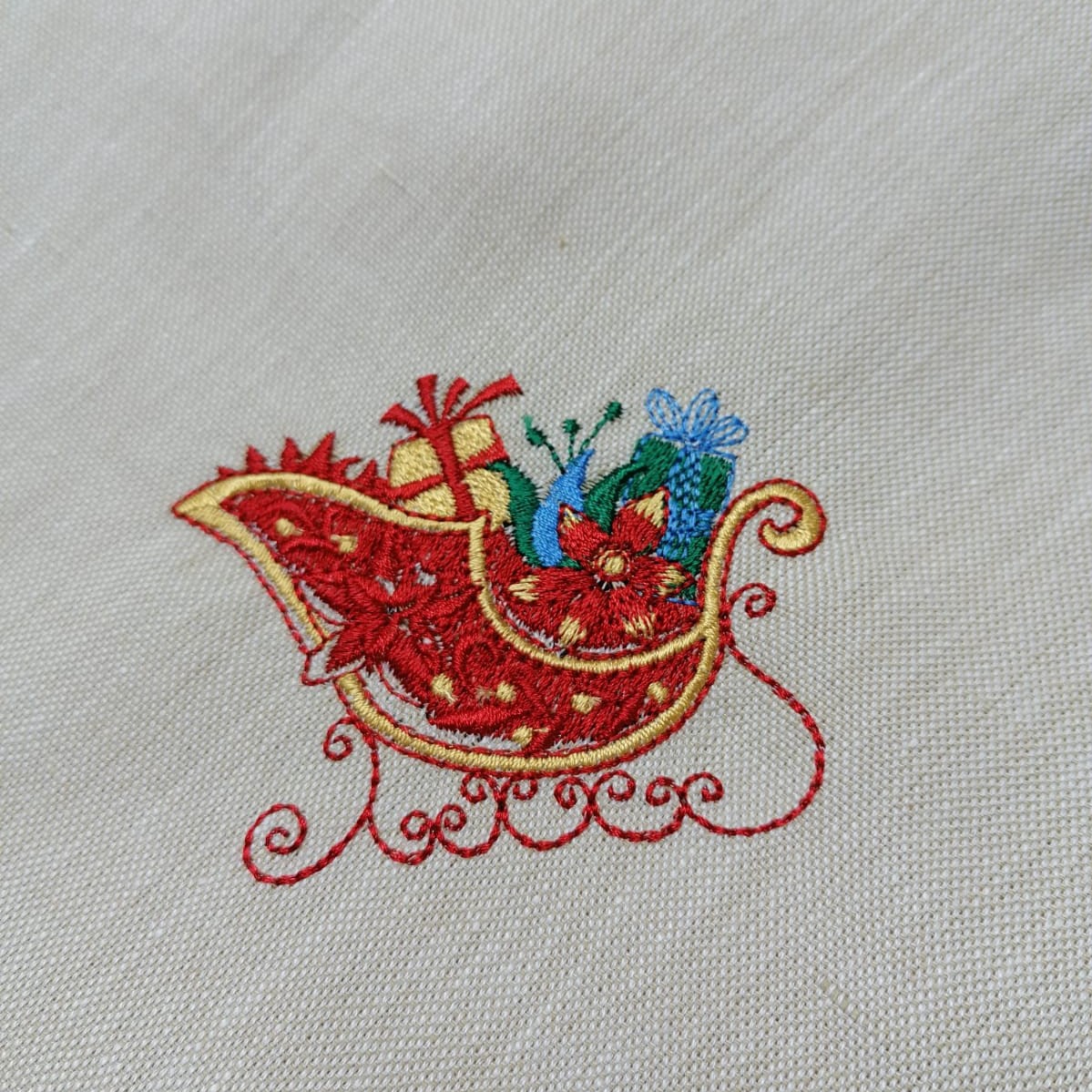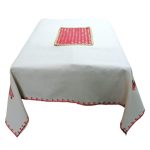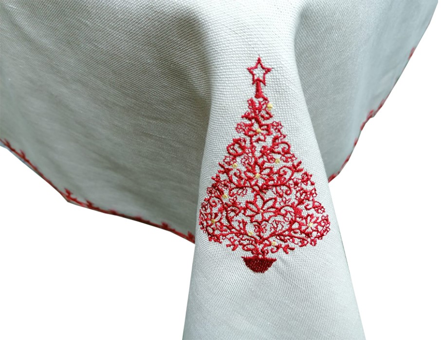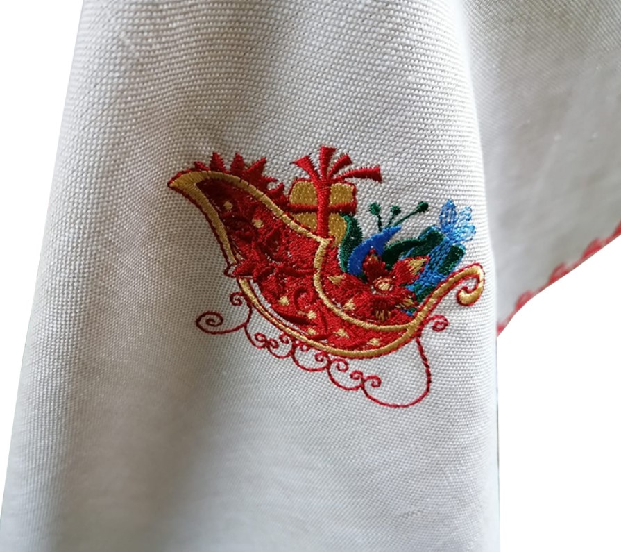 Fata de masa, broderie si bordura decorativa reni rosii, crem/rosu, imitatie in,130 x 130