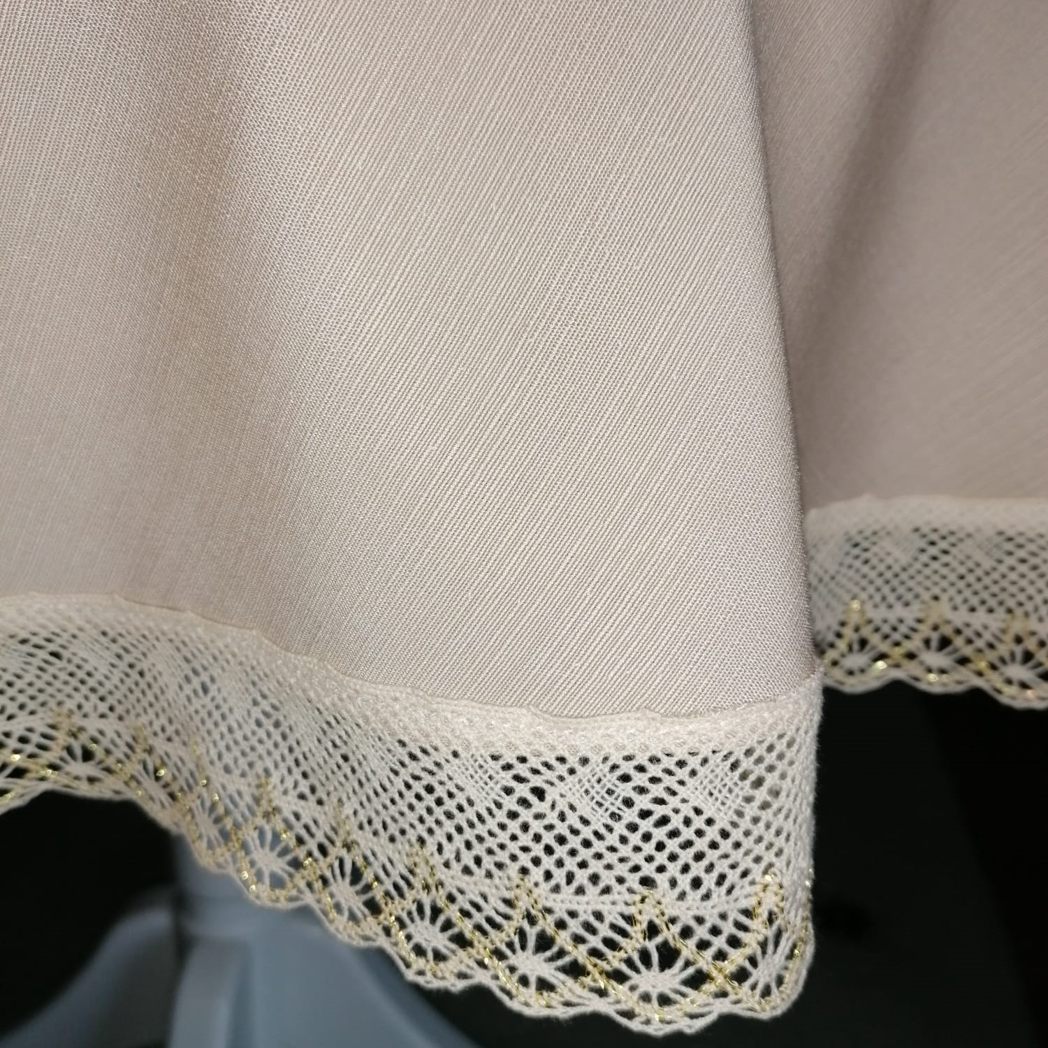 Fata de masa este un accesoriu decorativ inedit, menit sa se evidentieze in orice incapere Modelul deosebit si elegant, tesatura plina, precum si bordura ornamentata cu dantela crosetata din bumbac, vor da un aer aparte intregii incaperi, intregind bucuria si buna dispozitie specifice petrecerilor sau reuniunilor in familie. Broderia delicata este pusa in valoare si adauga piesei un plus de rafinament.