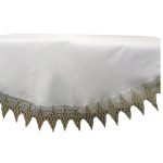 Fata de masa este un accesoriu decorativ inedit, menit sa se evidentieze in orice incapere Modelul deosebit si elegant, tesatura plina, precum si bordura ornamentata cu dantela crosetata din bumbac, vor da un aer aparte intregii incaperi, intregind bucuria si buna dispozitie specifice petrecerilor sau reuniunilor in familie. Broderia delicata este pusa in valoare si adauga piesei un plus de rafinament.