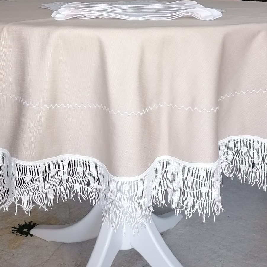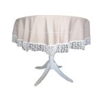 Fata de masa este un accesoriu decorativ inedit, menit sa se evidentieze in orice incapere Modelul deosebit si elegant, tesatura plina, precum si bordura ornamentata cu dantela crosetata din bumbac, vor da un aer aparte intregii incaperi, intregind bucuria si buna dispozitie specifice petrecerilor sau reuniunilor in familie. Broderia delicata este pusa in valoare si adauga piesei un plus de rafinament.