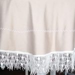 Fata de masa este un accesoriu decorativ inedit, menit sa se evidentieze in orice incapere Modelul deosebit si elegant, tesatura plina, precum si bordura ornamentata cu dantela crosetata din bumbac, vor da un aer aparte intregii incaperi, intregind bucuria si buna dispozitie specifice petrecerilor sau reuniunilor in familie. Broderia delicata este pusa in valoare si adauga piesei un plus de rafinament.