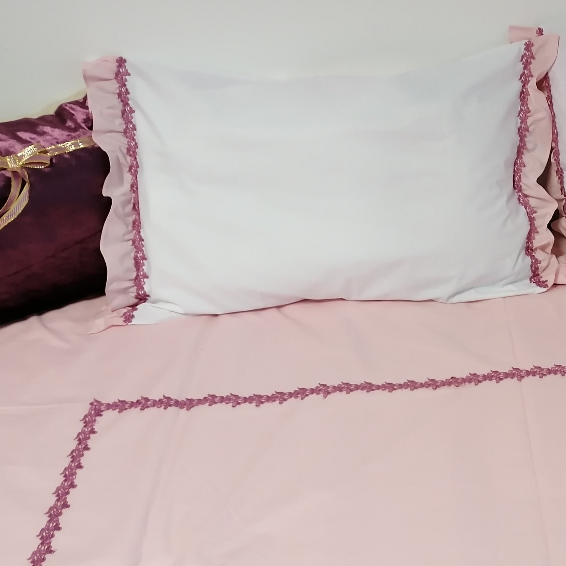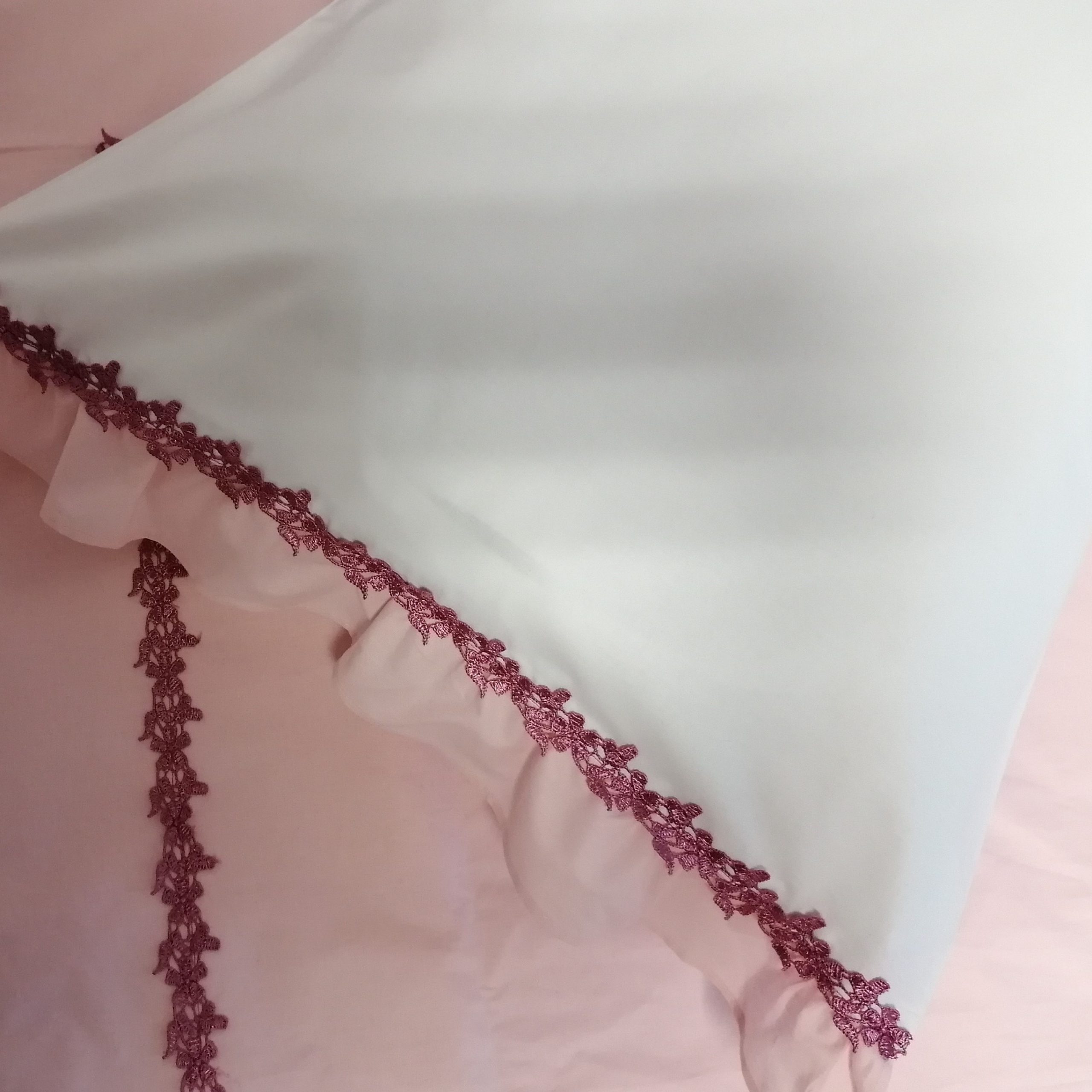Combinatia extrem de vie si vesela intre culorile roz si fucsia, chenarul din dantela ghipure si contrastul de culori, au capacitatea de a energiza o camera si de a crea o atmosfera favorabila visatului cu ochii deschisi.