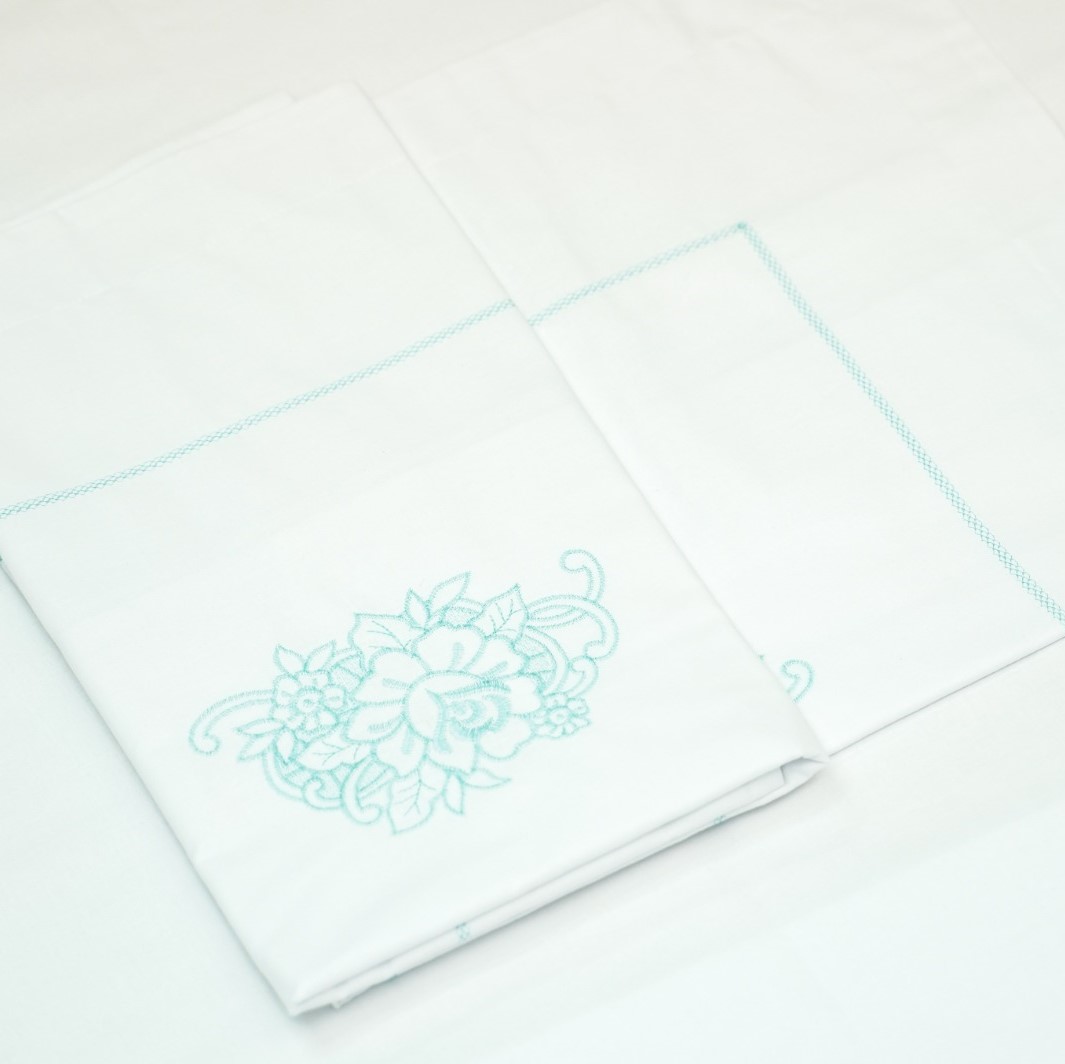 Husa pilota Casa Bucuriei, model Lebada, culoare alb/albastru turcoaz, bumbac 100%, brodata, 220 cm x 180 cm