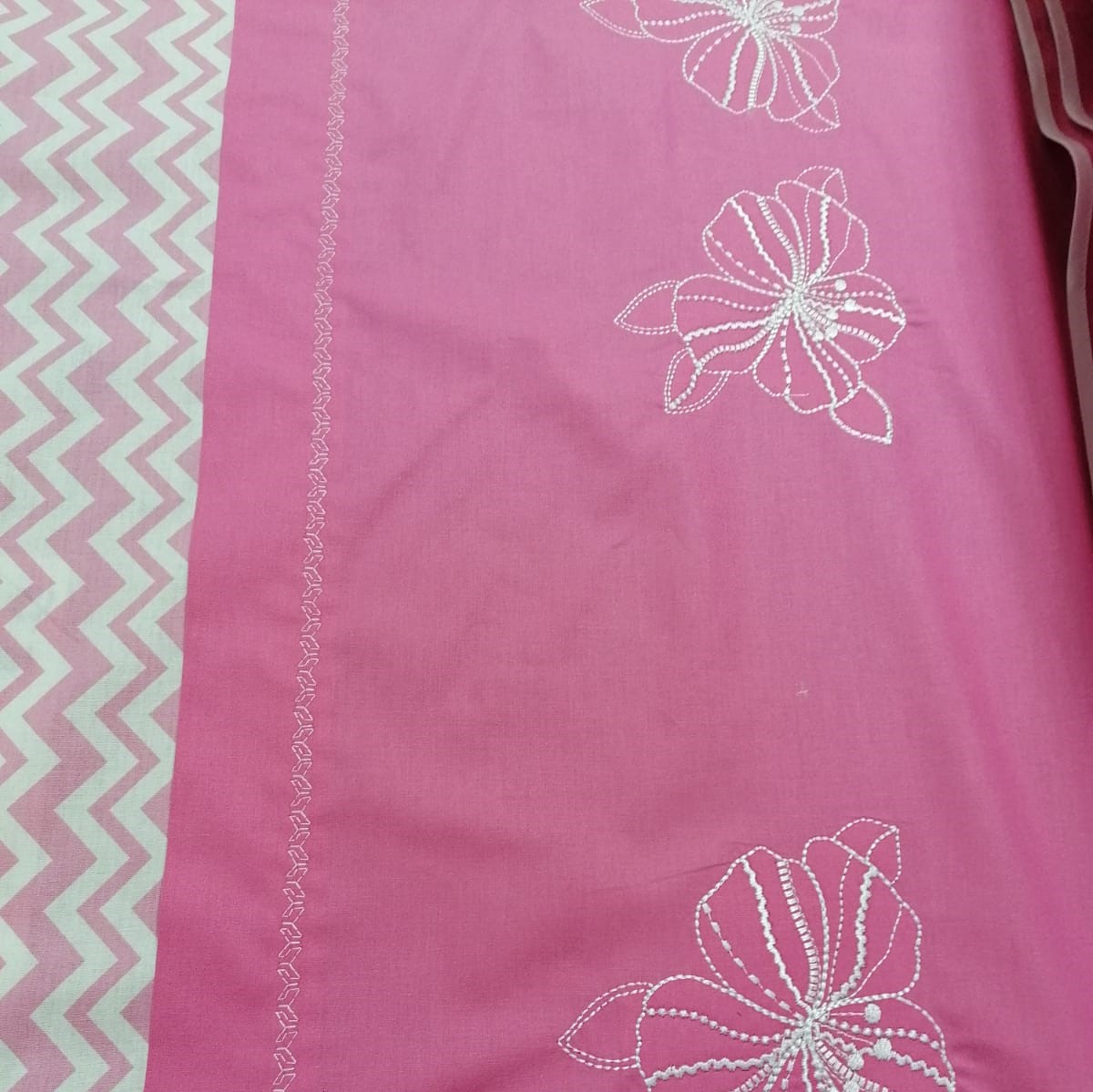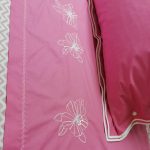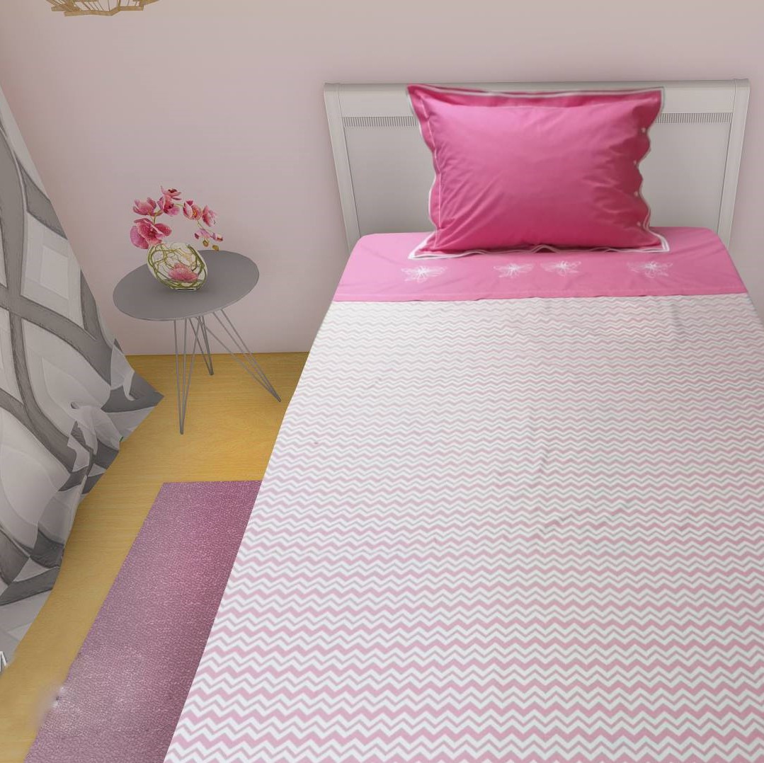 Husa de pilota Lucy este realizata din bumbac ranforce 100%, culoare roz , o nuanta feminina, delicata, care ofera un efect de confort si rafinament camerei, si este personalizata atat prin broderia care o infrumuseteaza si ii aduce valoare, cat si prin asortarea cu tesatura din bumbac imprimat cu dungi albe in zig-zag, oferind echilibrul perfect pentru un dormitor cu personalitate, dar in acelasi timp odihnitor.