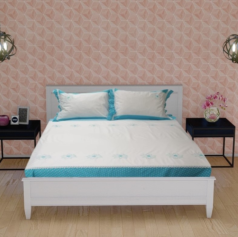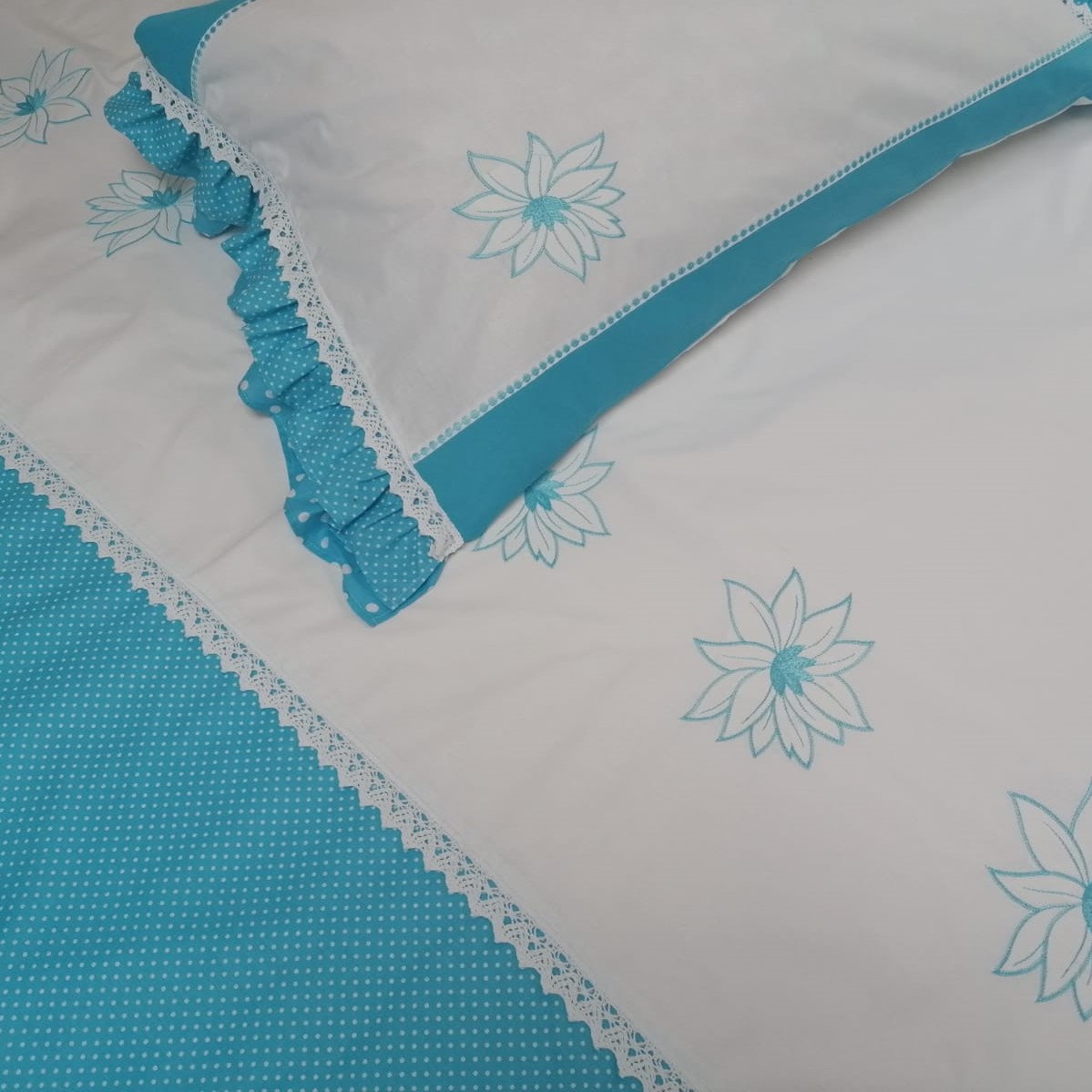 Husa pilota Casa Bucuriei, model Nuferi, culoare alb/albastru, bumbac 100%, brodata, 140 cm x 220 cm