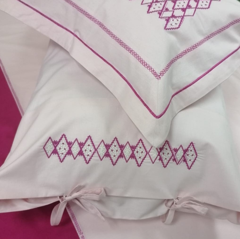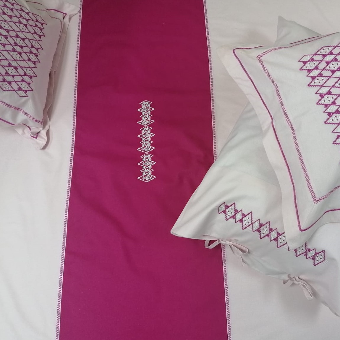 Lenjerie pat brodata Adriana , 5 piese, roz/roz fucsia , bumbac ranforce satinat 100%, 1 x husa pilota 200/220, 2 x fata perna 50/70, 2 x fata perna decorativa 40/40