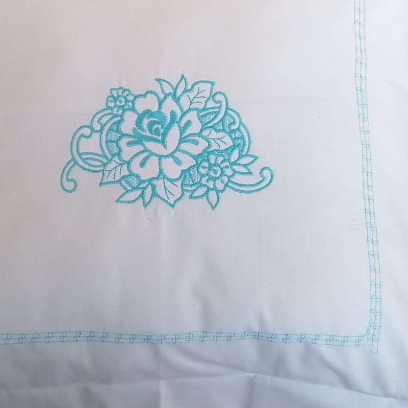 Set lenjerie pentru un pat dublu matrimonial, din bumbac satinat, cu broderie si paspoal albastru turcoaz.