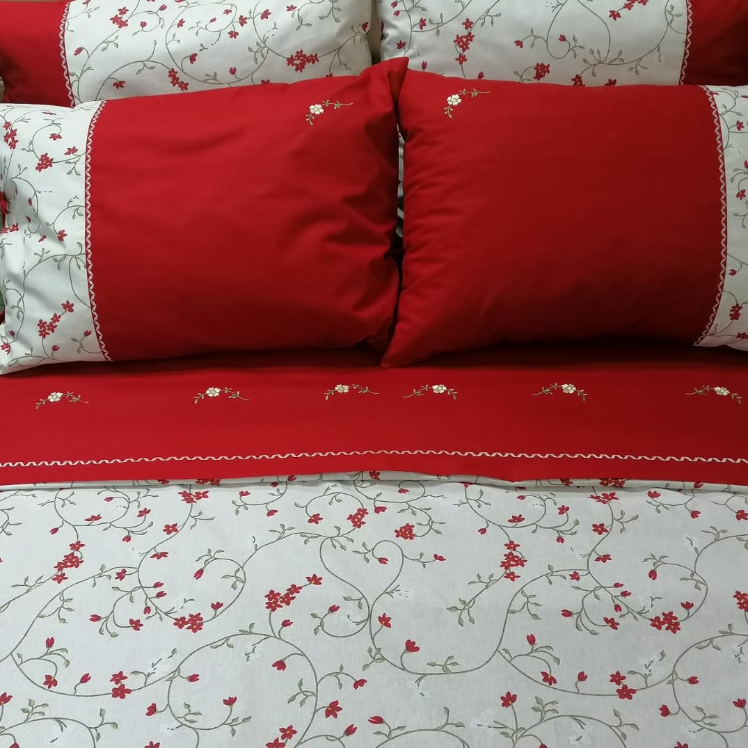 Setul de lenjerie de pat se remarca nu doar prin designul unic, accesorizata cu floricele brodate in ton cu imprimeul si cusatura decorativa, dar si prin calitatile materialului din care este confectionat: Bumbac ranforce 100%, o densitate a tesaturii mai mare ca bumbacul obisnuit, firul fiind mai fin si nepieptanat. Izoleaza bine caldura si se comporta bine si la temperaturi ridicate. Materialul natural este hipoalergenic si permite corpului sa respire. Bumbacul, datorita faptului ca permite aerului sa circule, absoarbe umezeala lasand pielea uscata si asigurand un somn linistit.