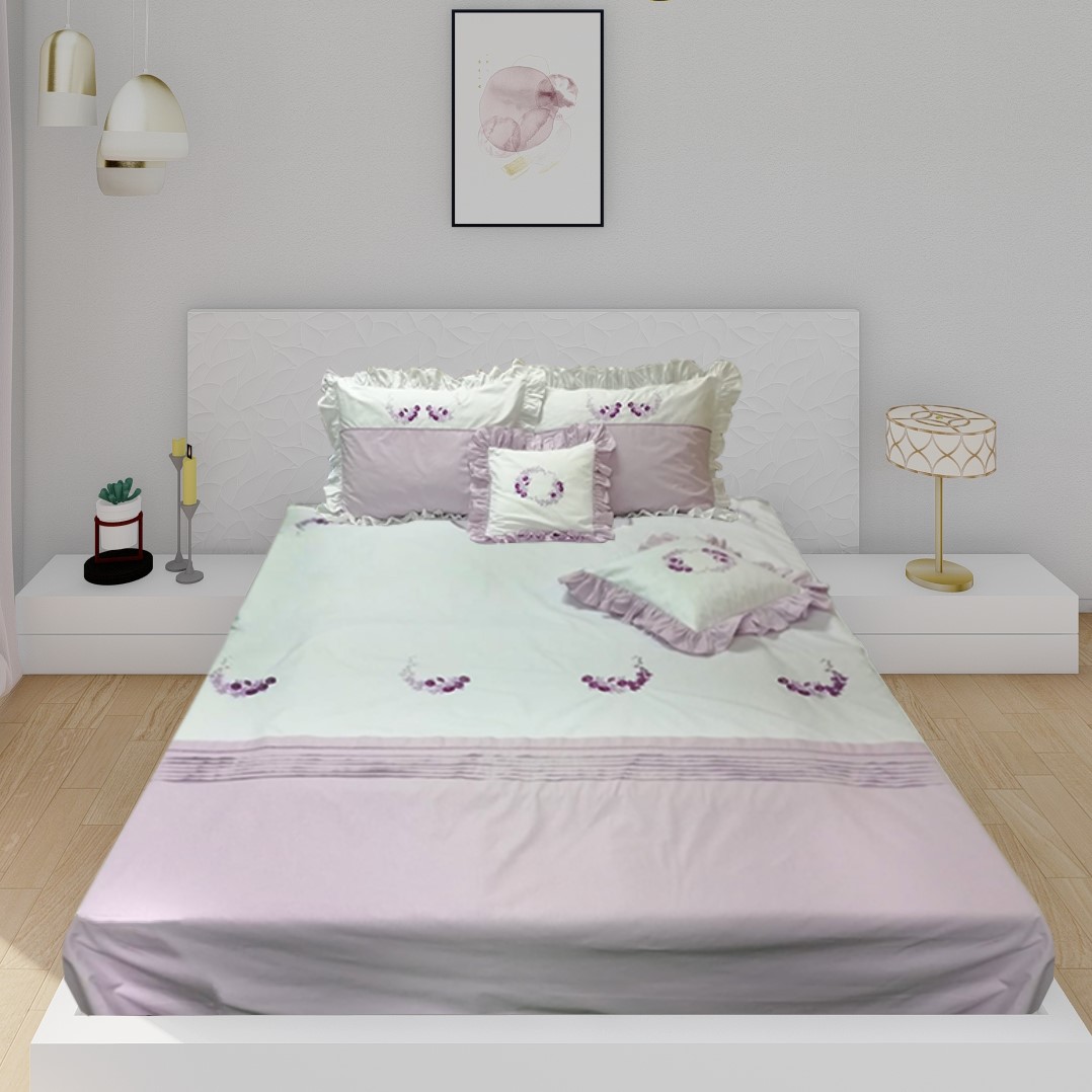 Pentru clipe de rasfat, modelul de lenjerie de pat cu broderie lila si violet confera incaperii un aer nobil, imitand senzatia atingerii de casmir.