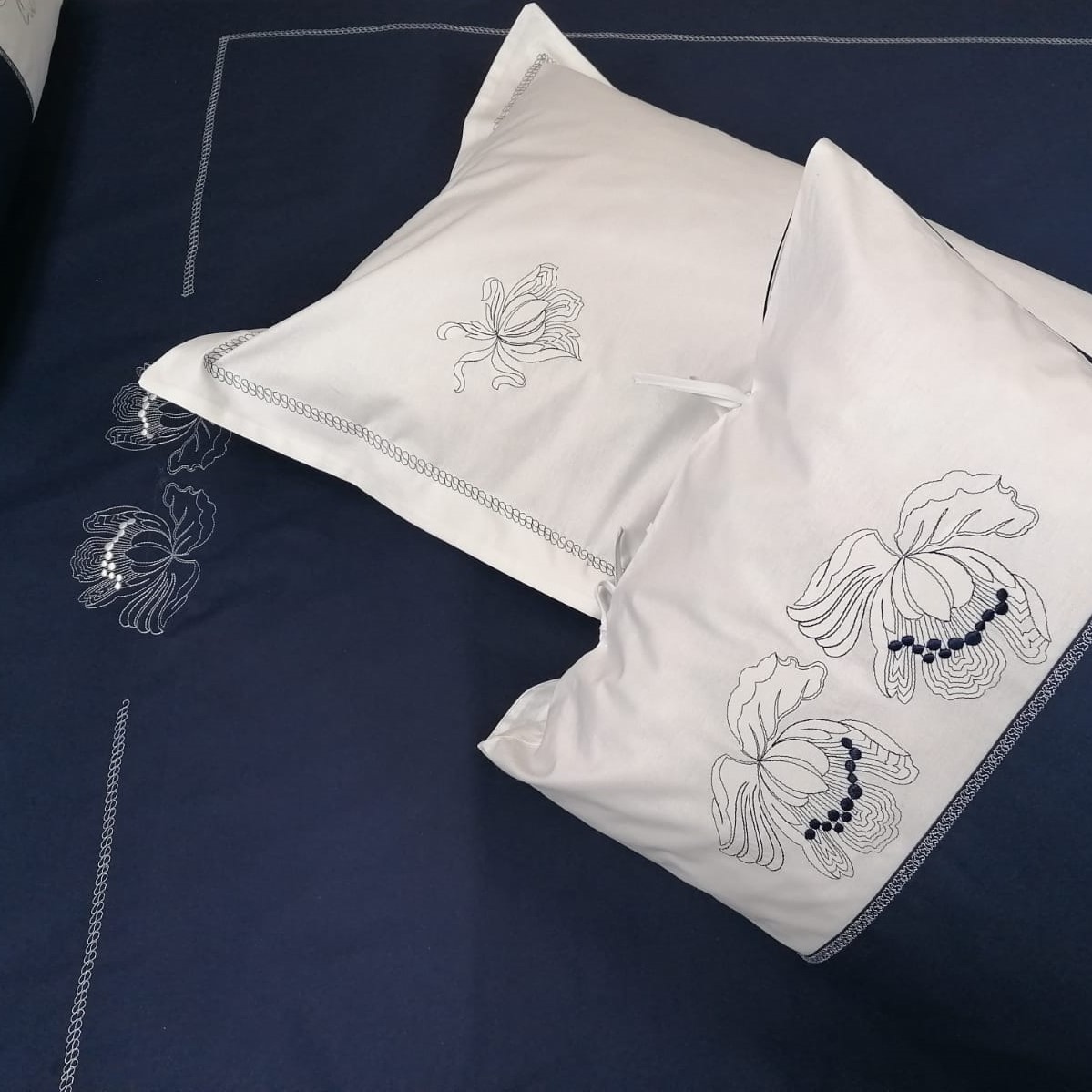 Lenjerie pat matrimonial, Casa Bucuriei, broderie, 6 piese, alb/bleumarin, bumbac ranforce 100% (1 husa pilota 220×180, 1 cearsaf de pat cu elastic 240 x 260 cm, 2 perna 50×70, 2 perne decorative 50×70)