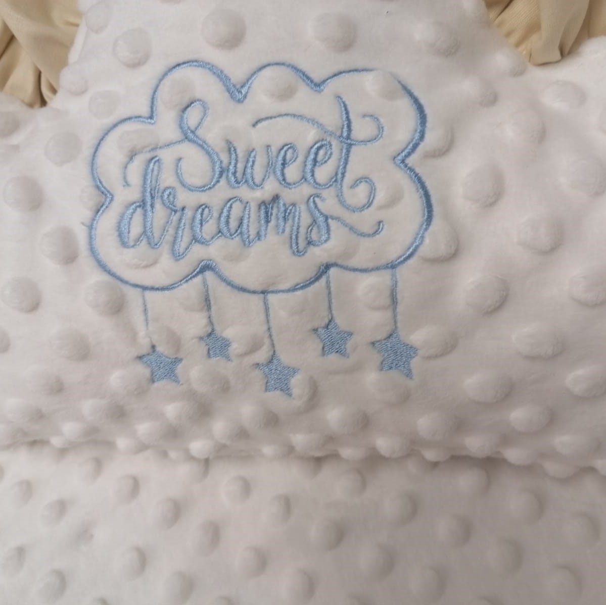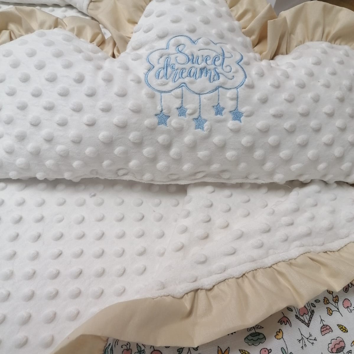 Perna cu volane, broderie si fata dubla este un decor minunat pentru camera copiilor, dormitor sau sufragerie. Datorit texturi catifelate, confectionata din plus minky, va atrage atat sugarii, cat si copiii mai mari. Este perfecta ca decor de fotografiere, perna de jocuri sau baldachin.