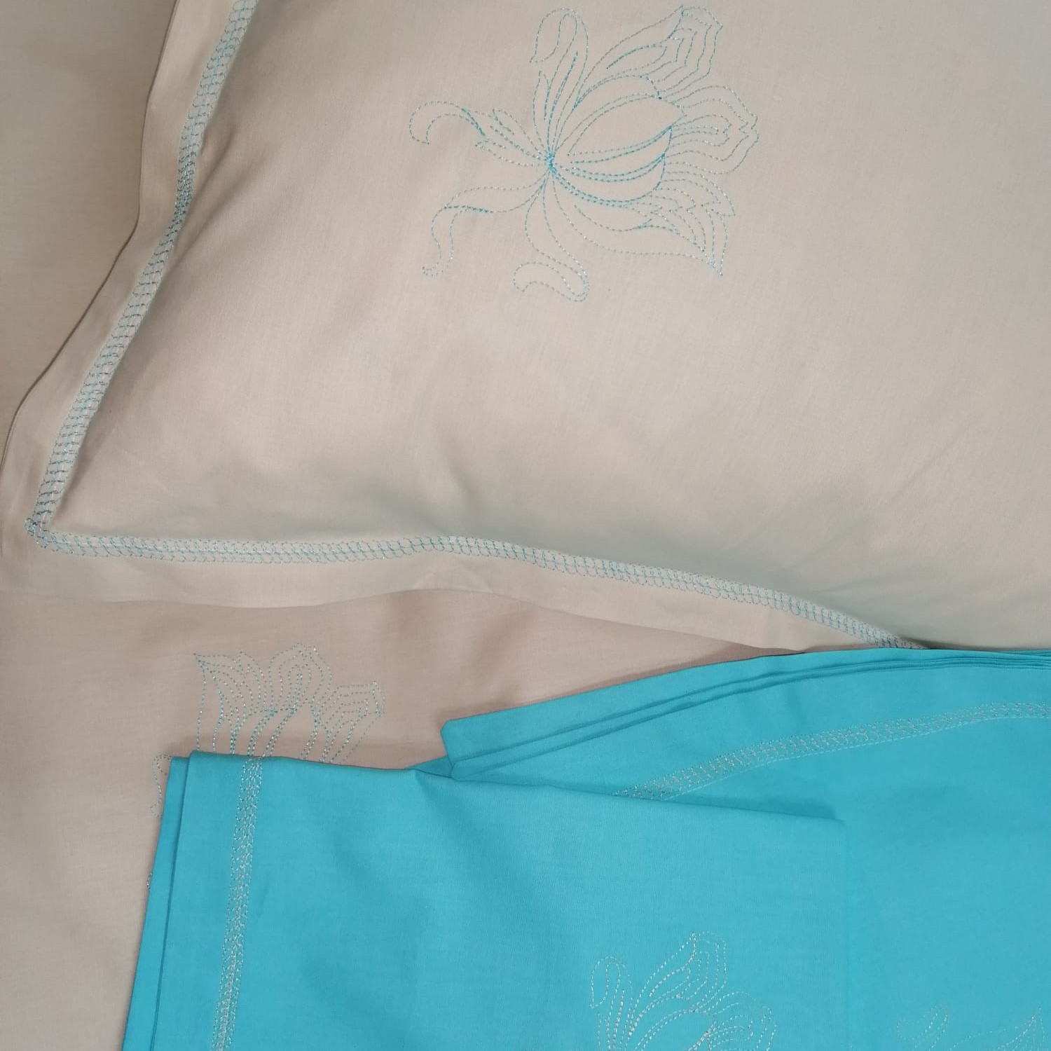 Set 2 Fete de perna Casa Bucuriei, model Clasic Iris, crem/turcoaz, bumbac 100%, 40 x 40 cm