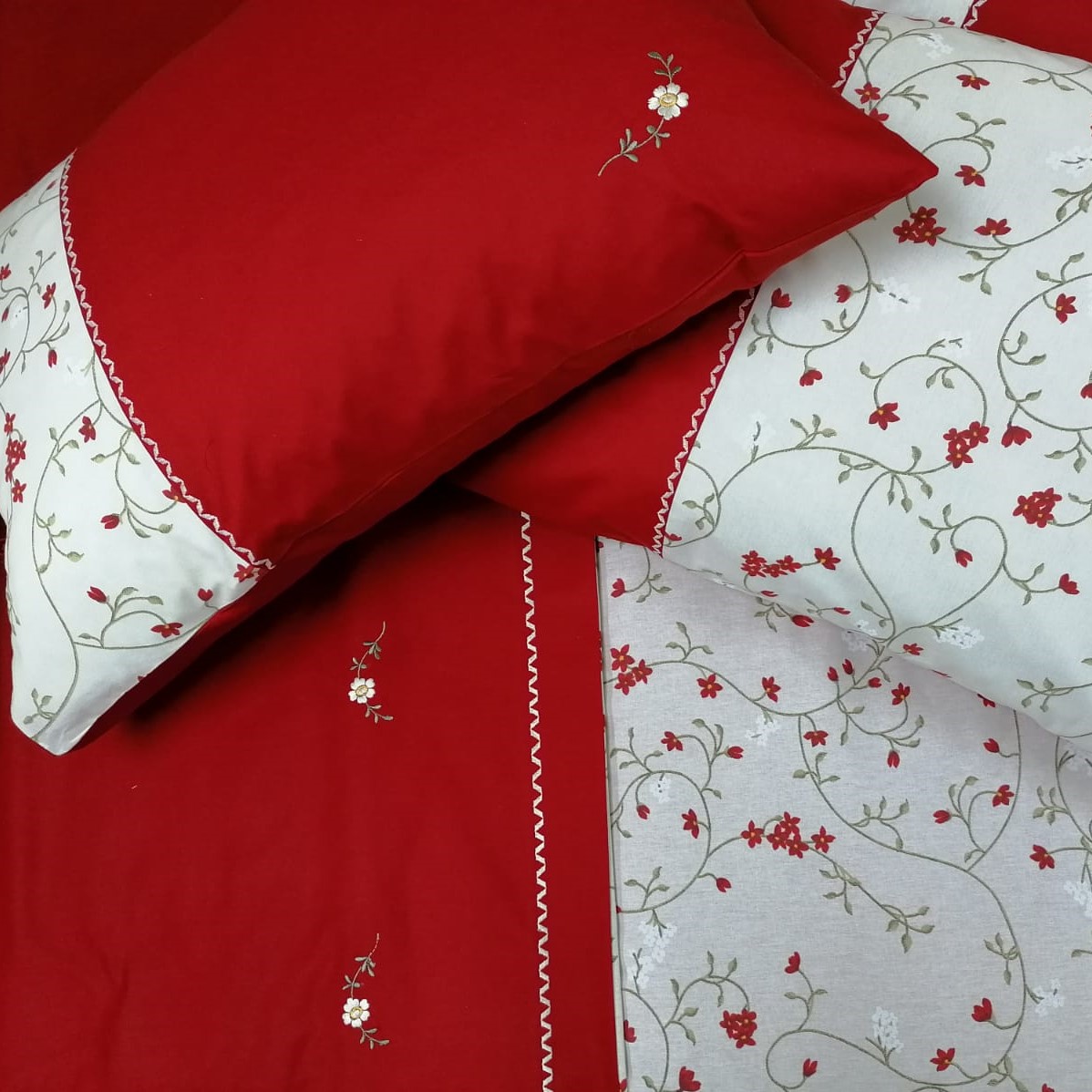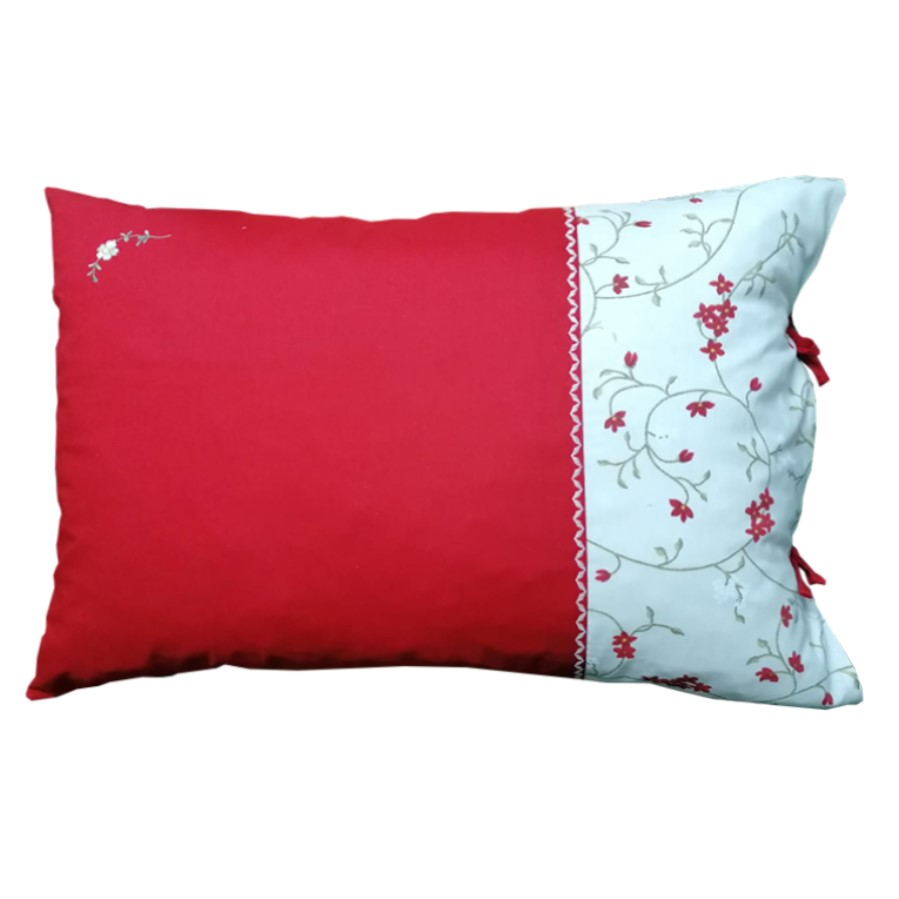 Designul fetelor de perna, in stilul shabby chic, cu imprimeu floral discret pe fundal ivoar, broderia si contrastul de culori ivoar si rosu, realizat prin cusatura decorativa, cat si tesatura naturala, fac din aceasta fata de perna una foarte fashion si moderna si la fel de atragatoare acum ca si atunci cand a fost pentru prima data in voga. Materialul pe care l-am ales, bumbacul natural fabricat din planta cu acelasi nume, este un produs non-alergen si poate reprezenta alegerea potrivita de material textil, chiar si pentru copii sau persoanele cu pielea sensibila.