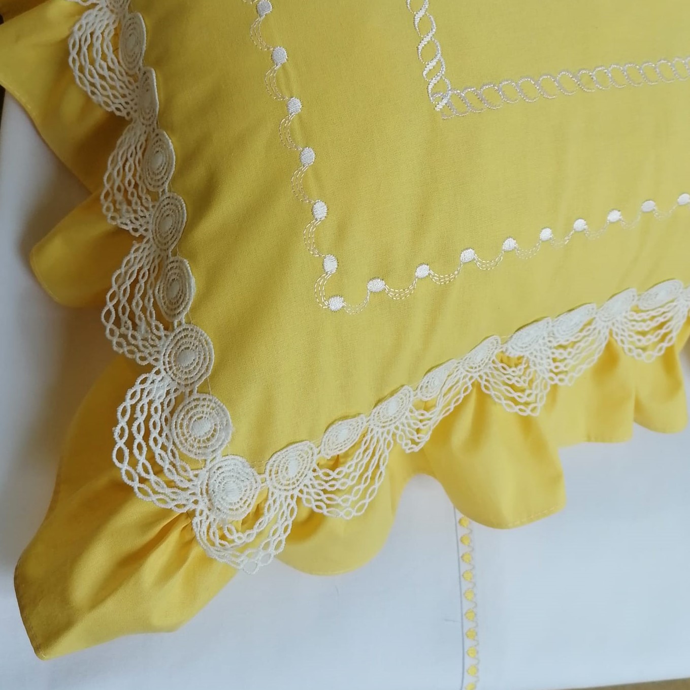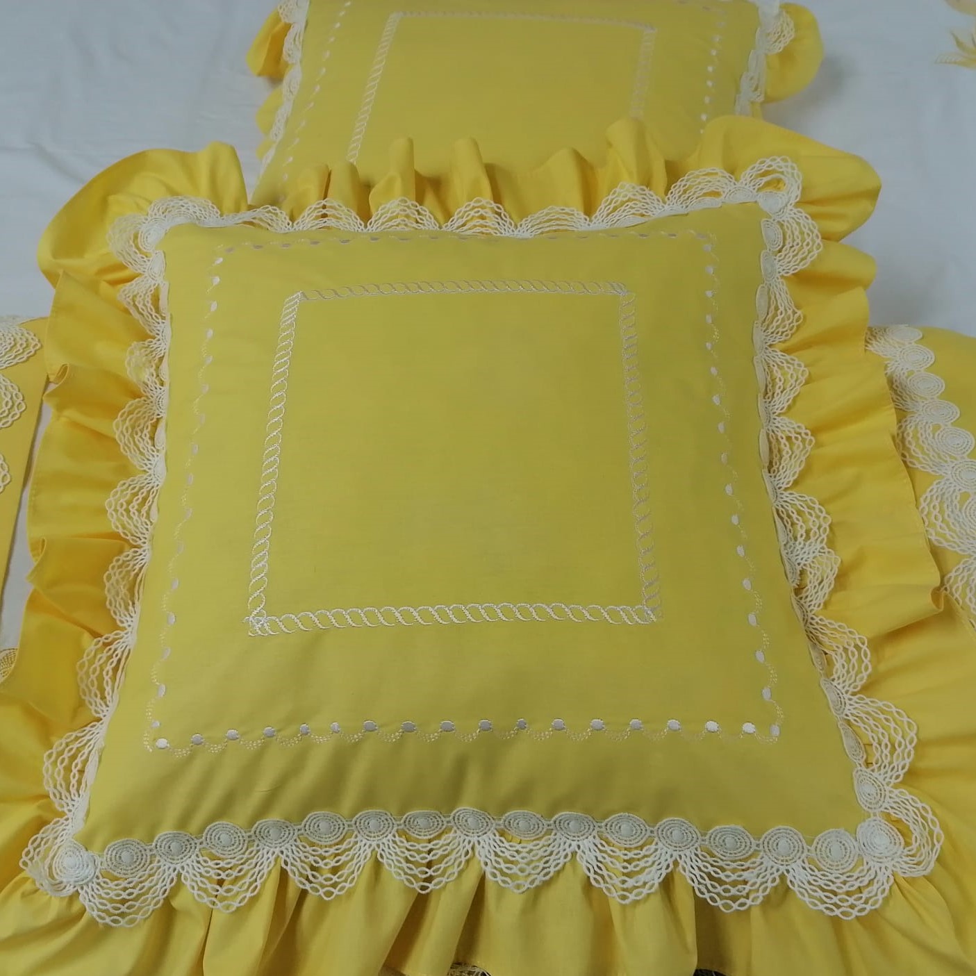 Setul de fete de perna este lucrat manual cu grija la fiecare detaliu in atelierul nostru.