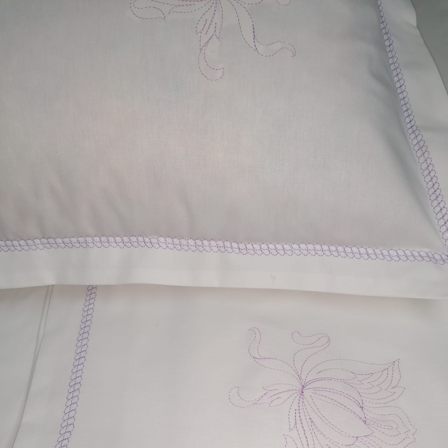 Set 2 huse perna brodate 40 x 40 cm, Casa Bucuriei, model Clasic Iris, alb/mov, bumbac natural100%