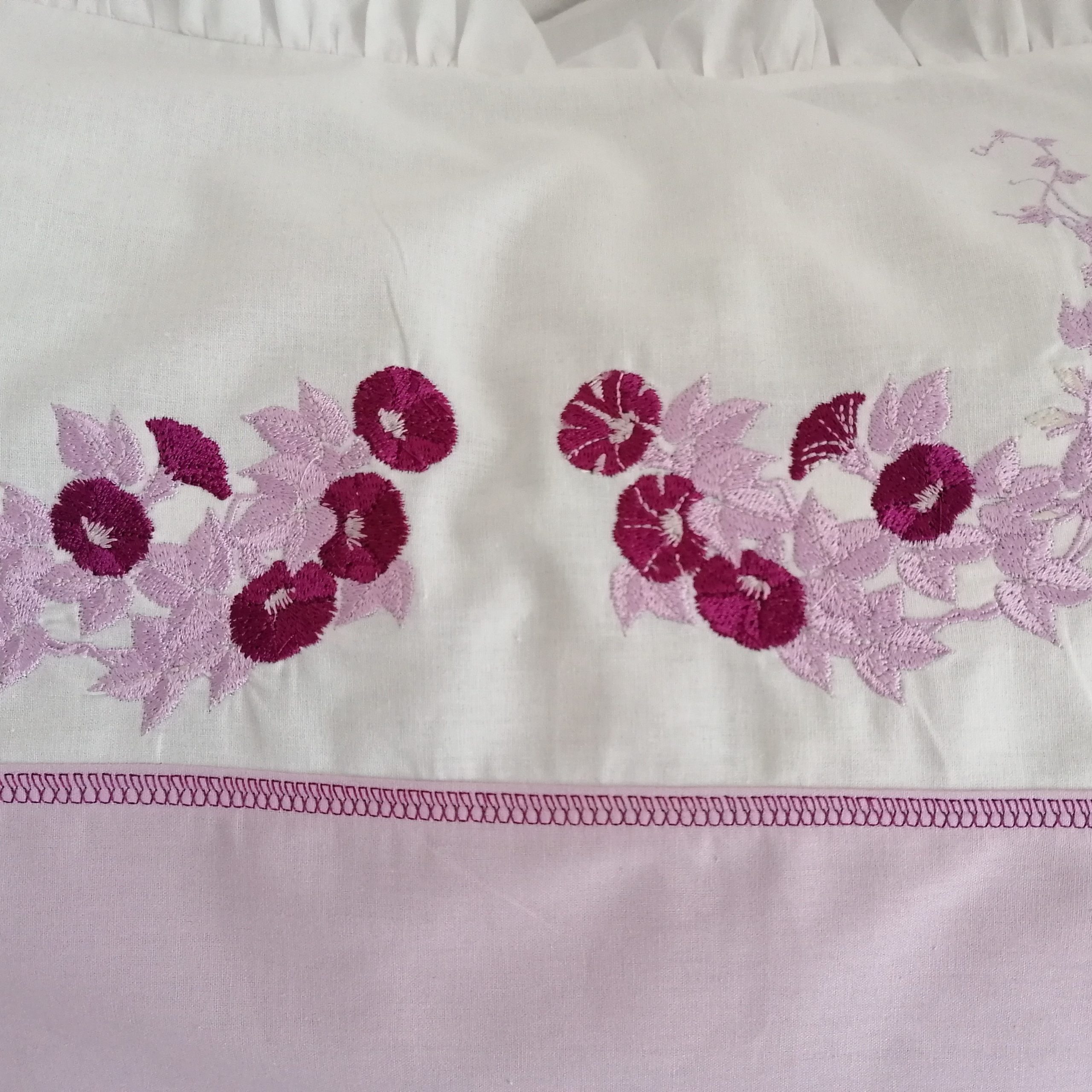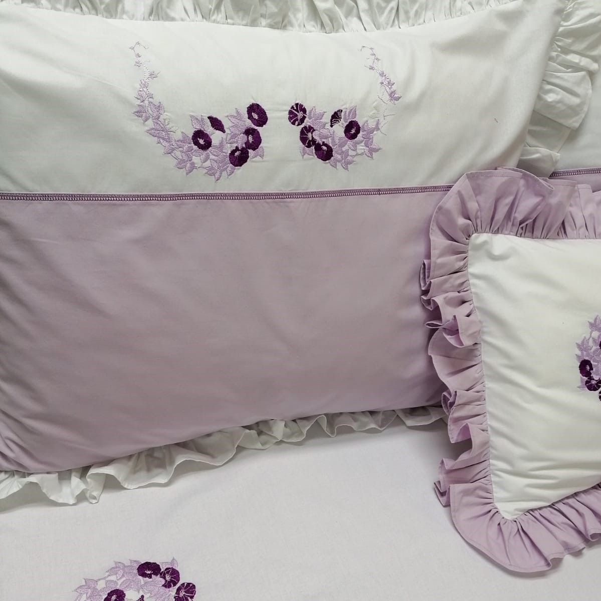 Pentru clipe de rasfat, modelul de husa de perna cu broderie lila si violet confera incaperii un aer nobil, imitand senzatia atingerii de casmir.