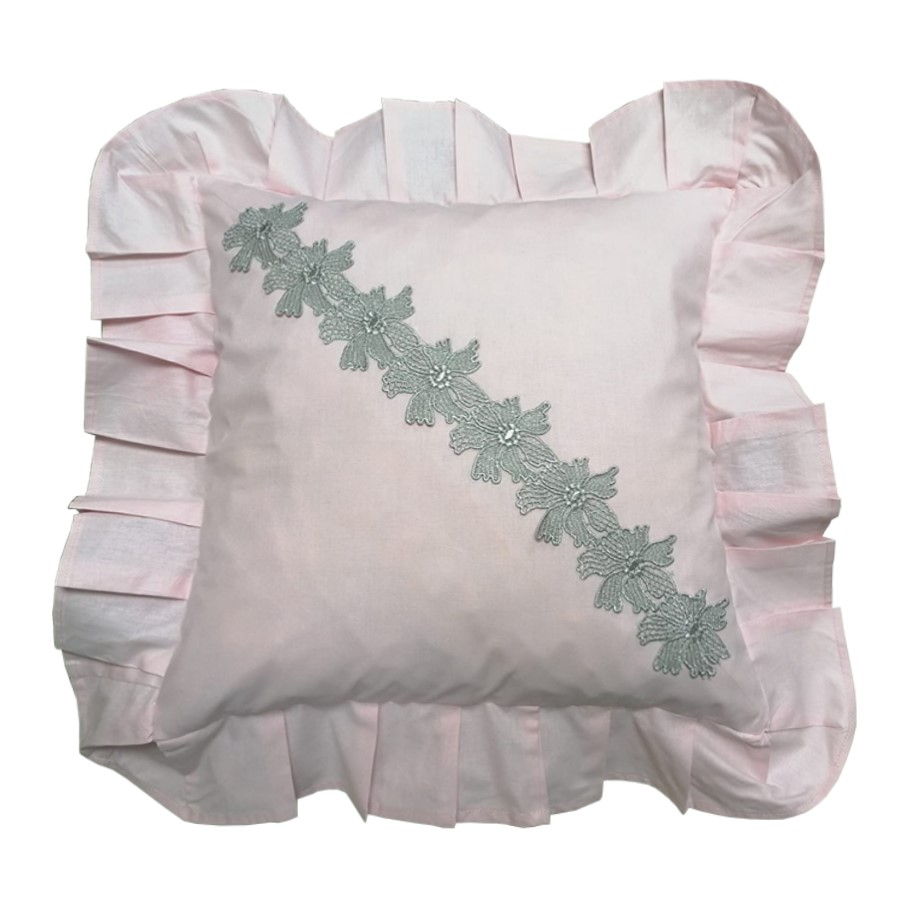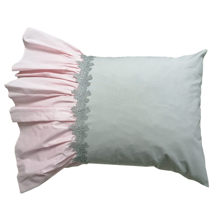 Set 2 x Husa perna decorativa Casa Bucuriei, aplicatie dantela, roz/gri, bumbac, 50×70, 45×45