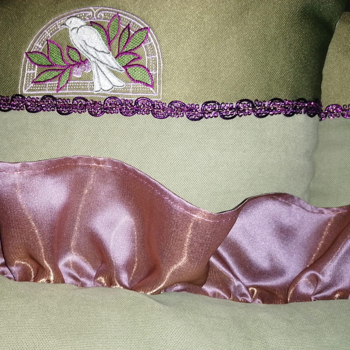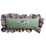 Designul fetelor de perna, in stil boem, broderia si contrastul de culori mov si verde, realizat prin galonul aplicat si prin volanase, fac ca acest set de perne decorative sa fie o solutie foarte practica pentru cei care doresc un decor dus dincolo de tiparele moderne.