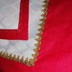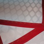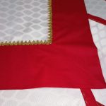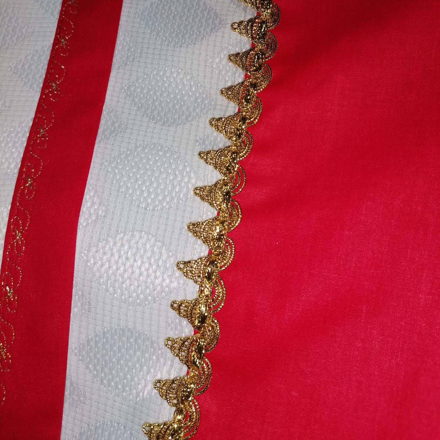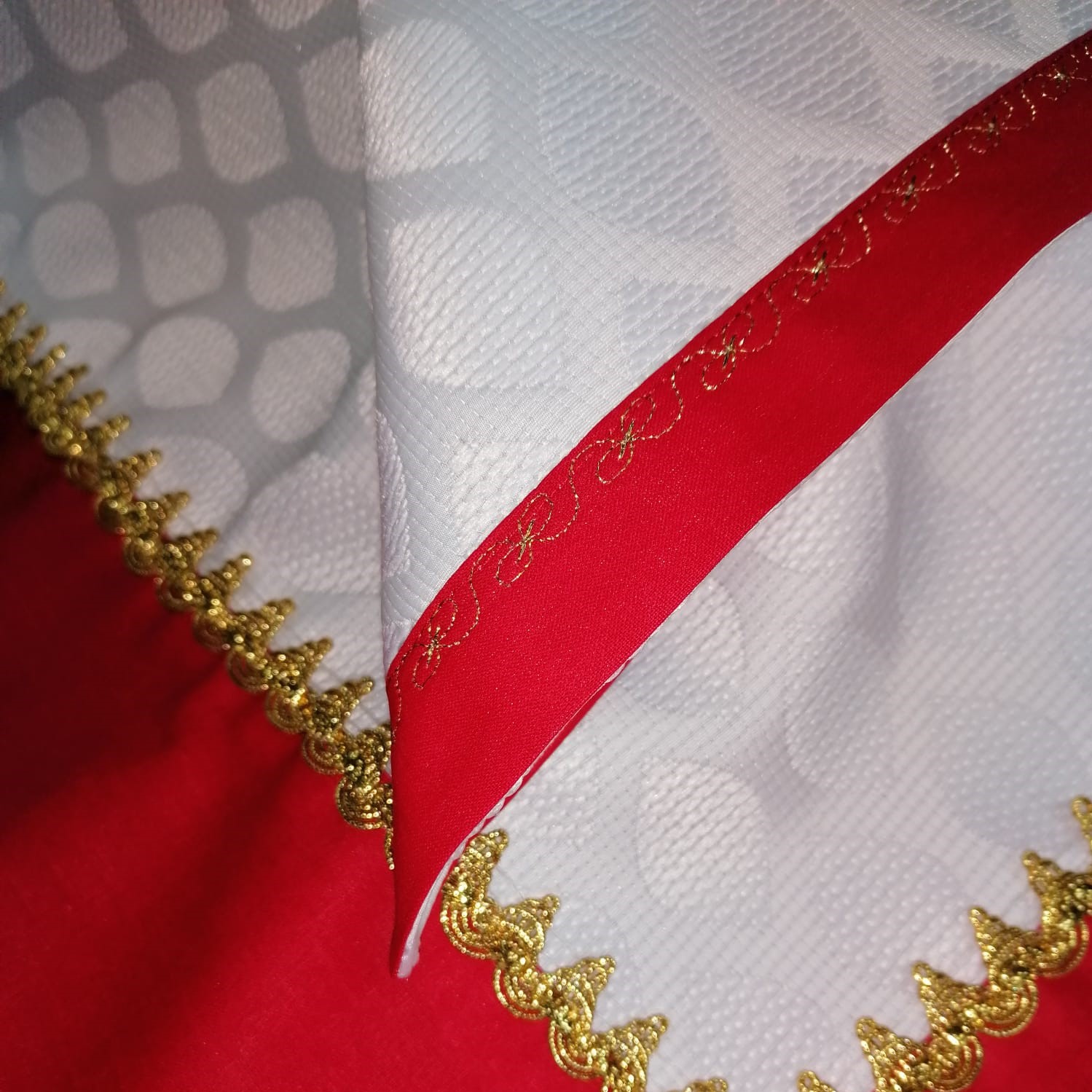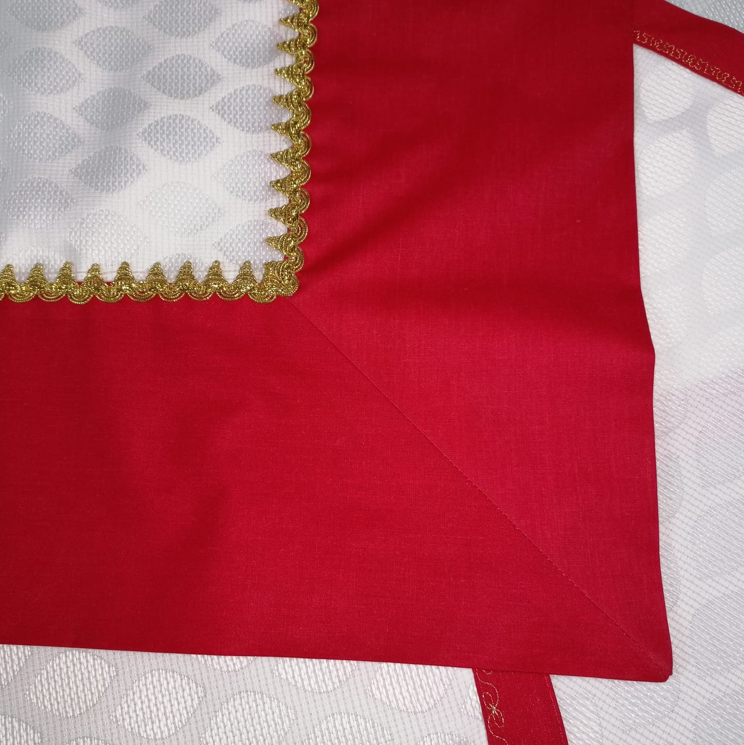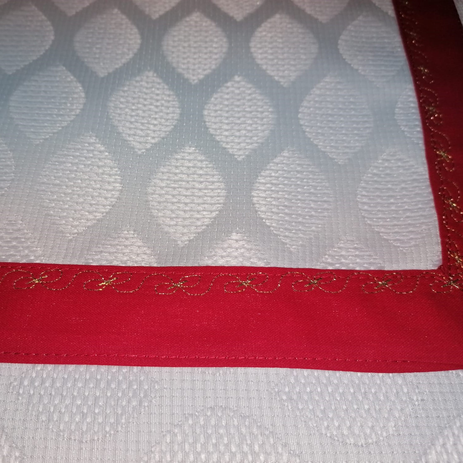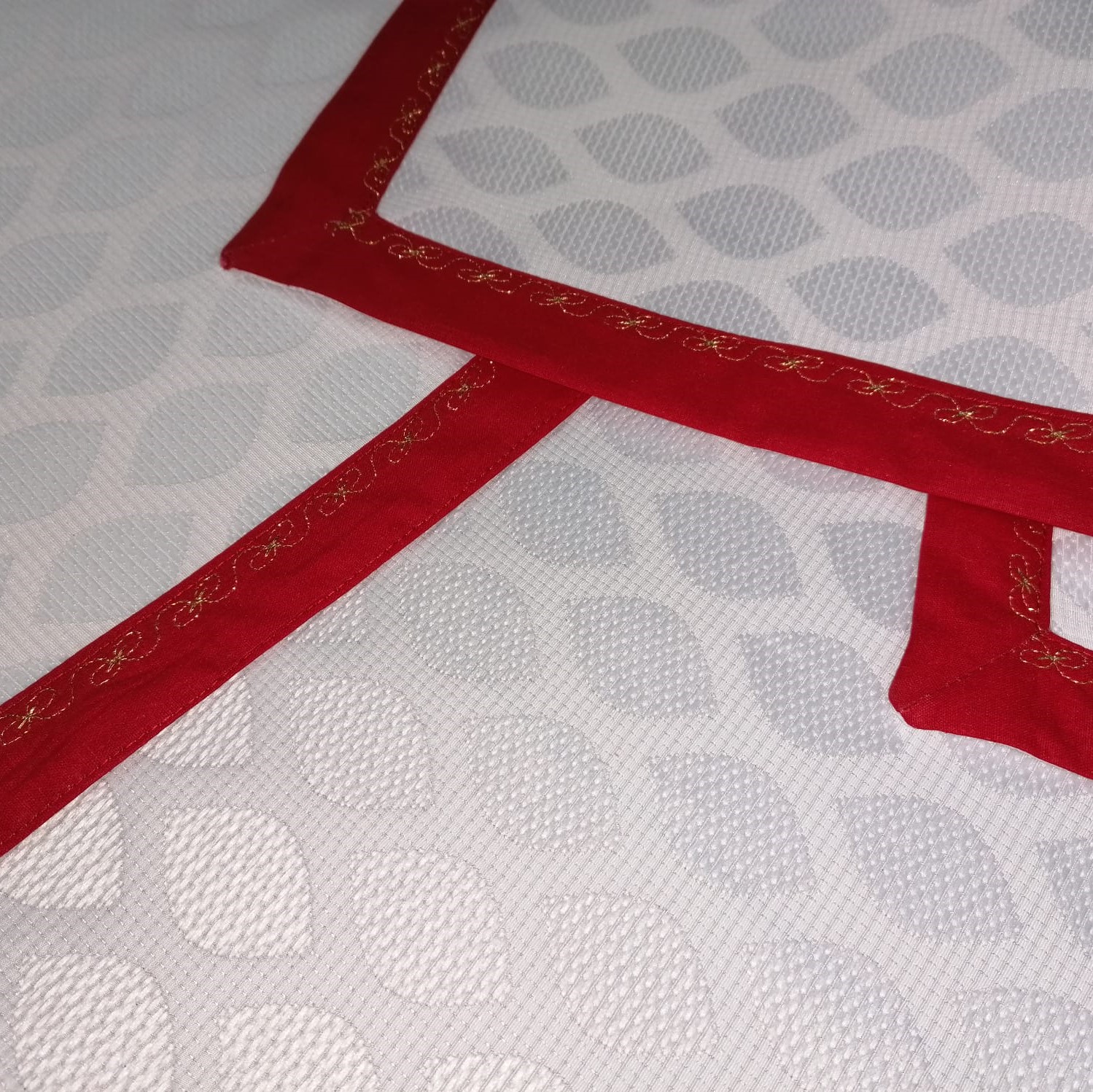 Setul este ideal pentru o masa festiva. Modelul modern si elegant, tesatura din brocart, precum si bordura rosie ornamentata cu galon auriu vor da un aer aparte intregii incaperi, intregind bucuria si buna dispozitie specifice petrecerilor sau reuniunilor in familie.