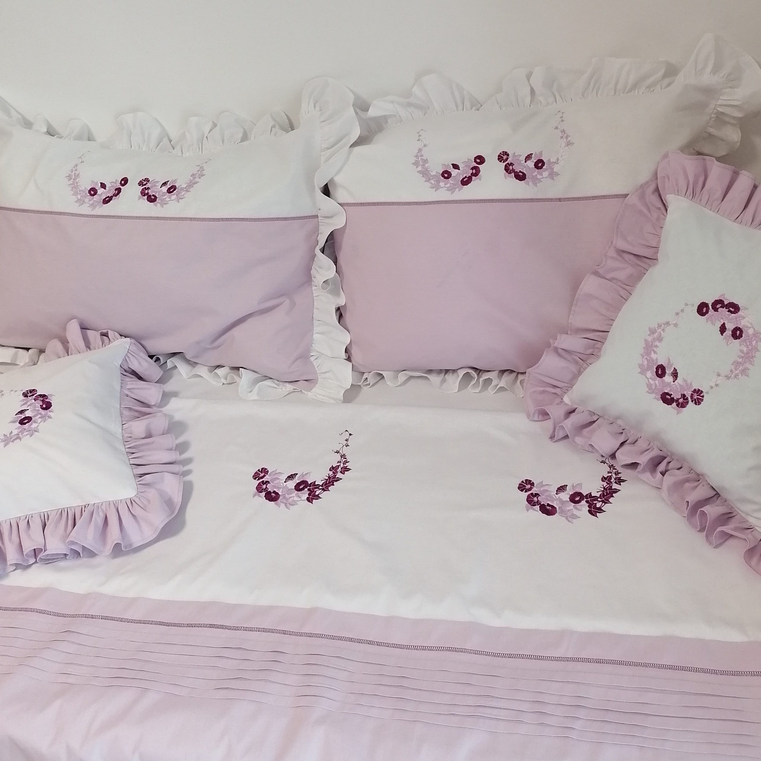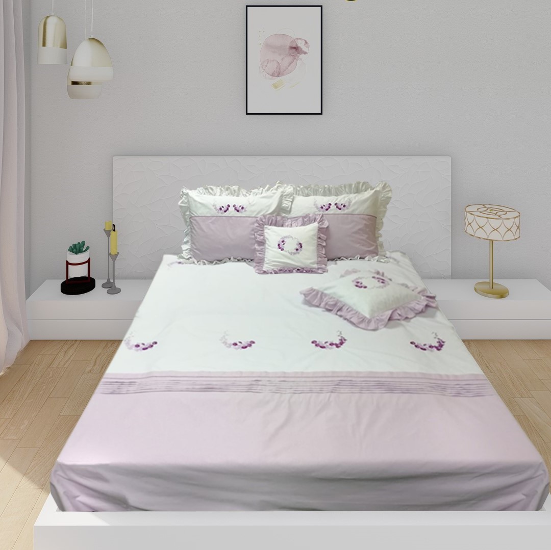Pentru clipe de rasfat, modelul de lenjerie de pat cu broderie lila si violet confera incaperii un aer nobil, imitand senzatia atingerii de casmir.