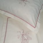 Set lenjerie pentru un pat dublu matrimonial, din bumbac satinat, cu broderie, detalii si finisaje decorative.