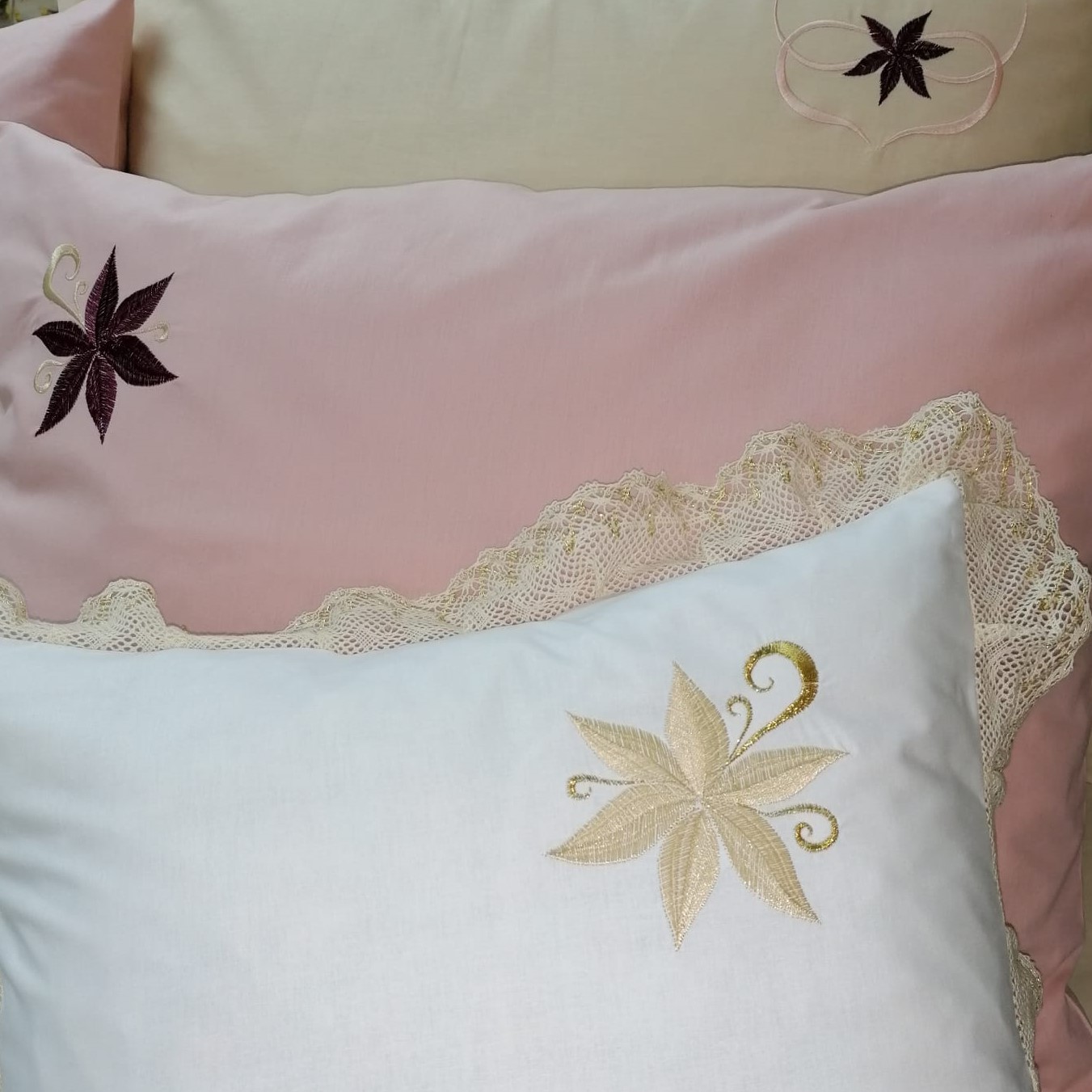 Set Lenjerie pat brodata 220 cm x 250 cm, Casa Bucuriei, model Dulcis, 3 piese, roz prafuit, bumbac natural 100%