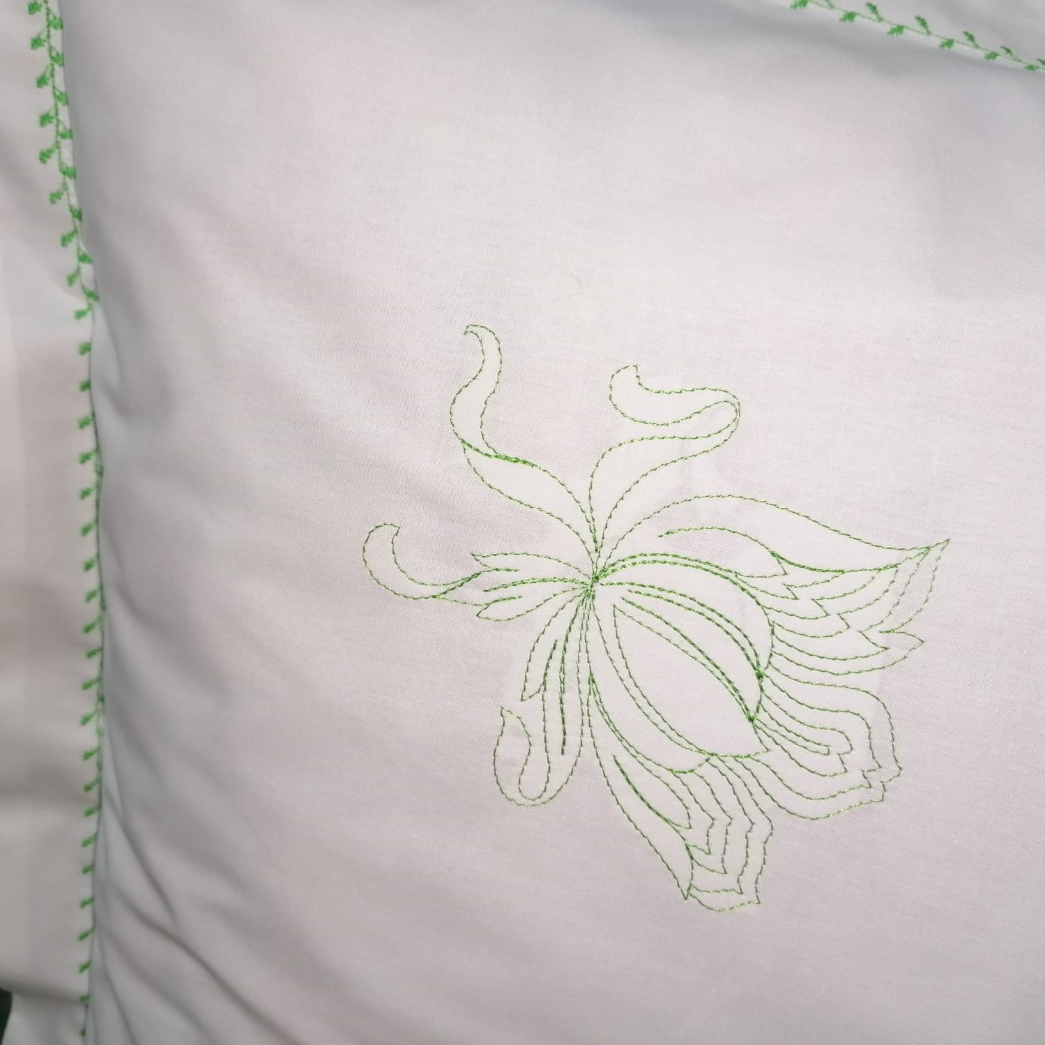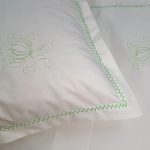 Set lenjerie pentru un pat dublu matrimonial, din bumbac satinat, cu broderie, detalii si finisaje decorative.