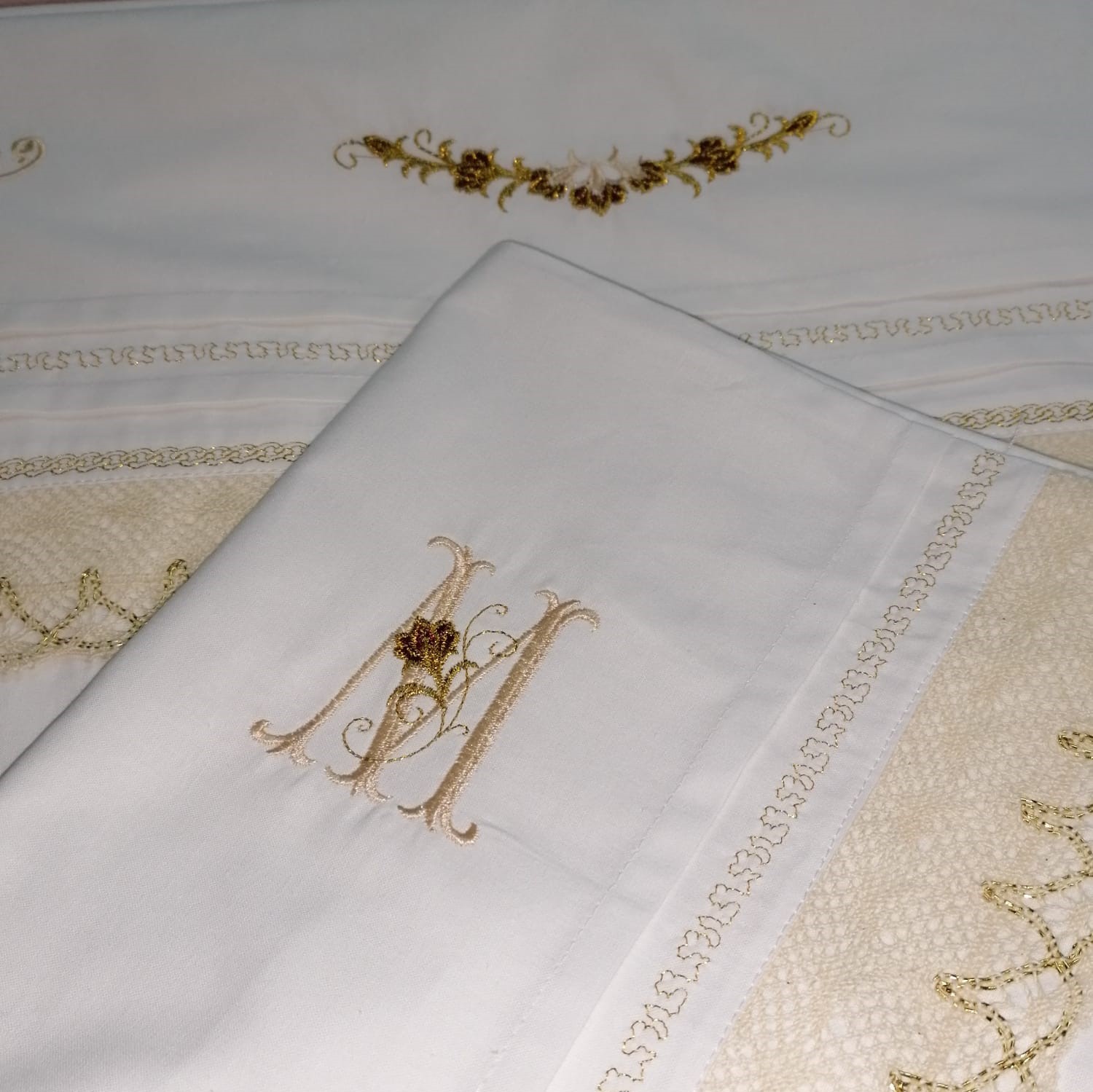 Set lenjerie pat brodata 260 x 280 cm, Casa Bucuriei, model Dulcis, 6 piese, alb/auriu, bumbac ranforce 100%, pilota 210 x 230 cm