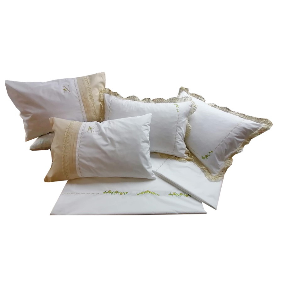 2 fete de perna 50 × 70 cm, personalizate prin broderie cu initiala numelui ( Dupa plasarea comenzi veti fi sunat pentru a ne comunica initialele pe care sa le brodam pe fetele de perna)
