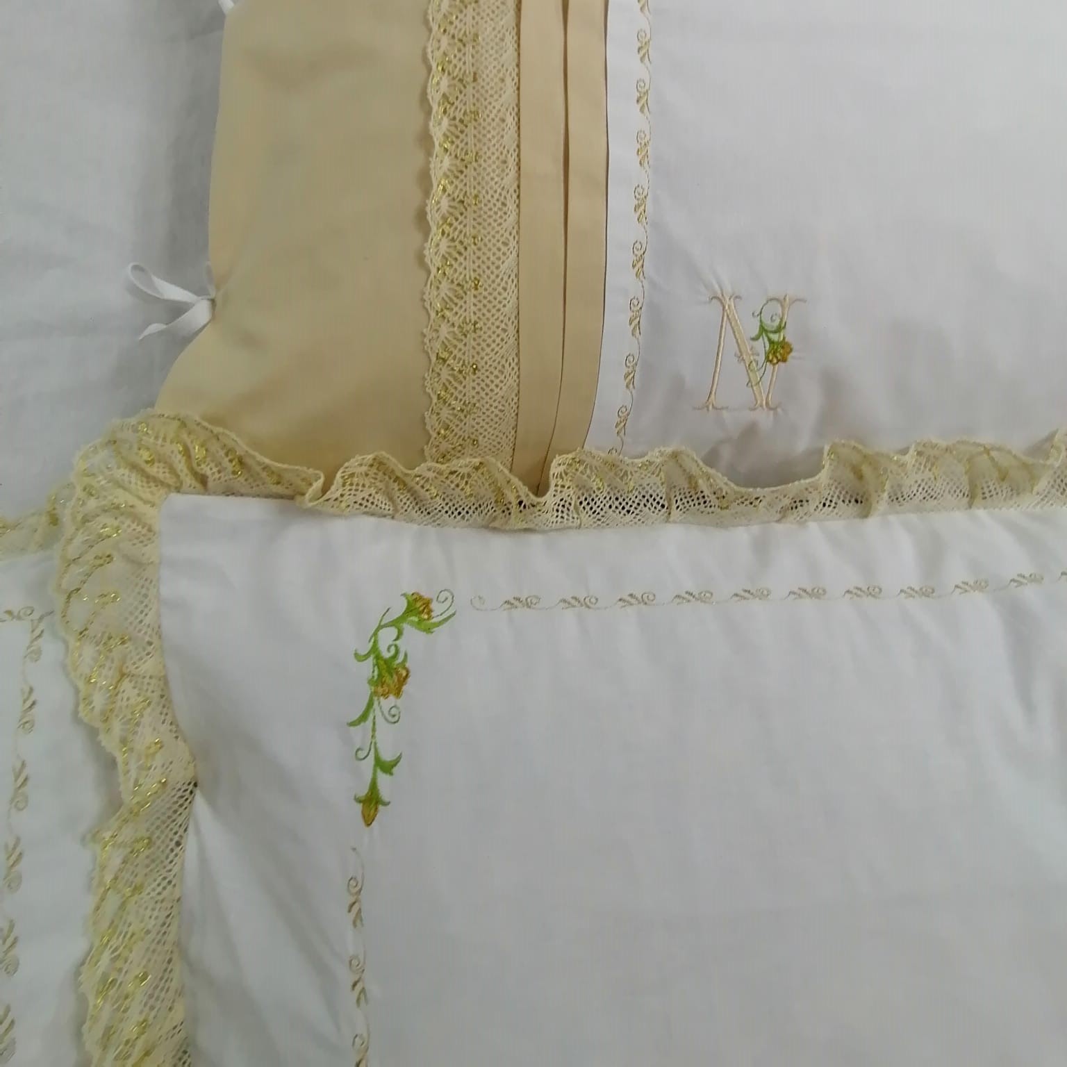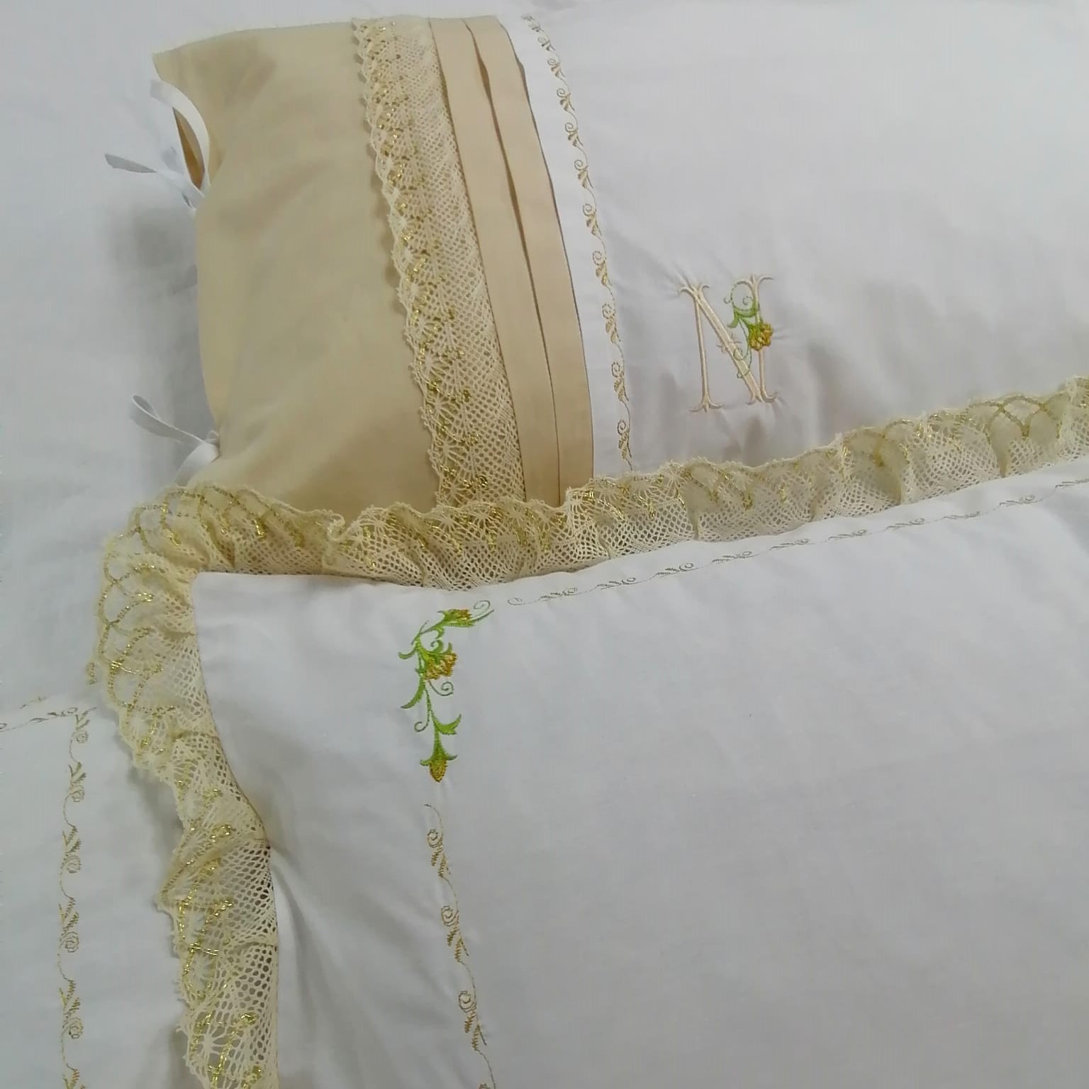 2 fete de perna 50 × 70 cm, personalizate prin broderie cu initiala numelui ( Dupa plasarea comenzi veti fi sunat pentru a ne comunica initialele pe care sa le brodam pe fetele de perna)