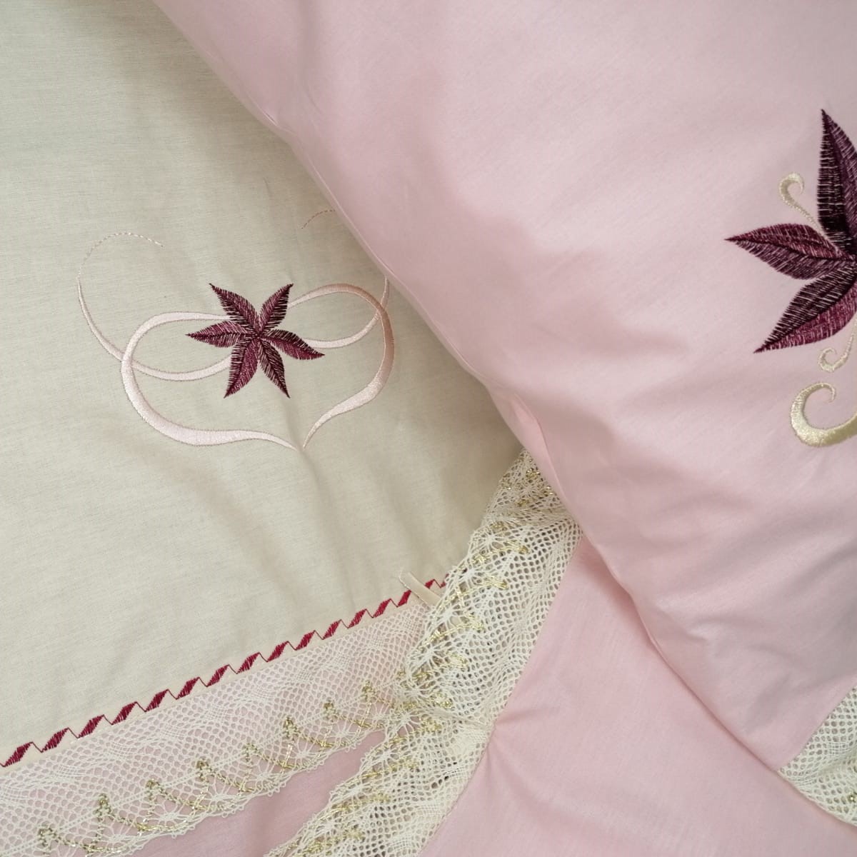 Set Lenjerie pat brodata 290 cm x 270 cm, Casa Bucuriei, model Dulcis, 3 piese, roz prafuit, bumbac natural 100%
