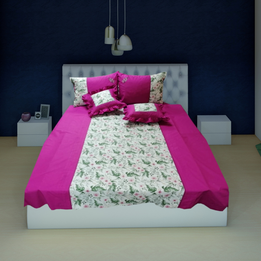 Set Lenjerie pat Casa Bucuriei, gama Sensy, 5 piese, culoare alb/fucsia, bumbac 100%, marime husa pilota 200 x 220, cearsaf pat 240 x 260