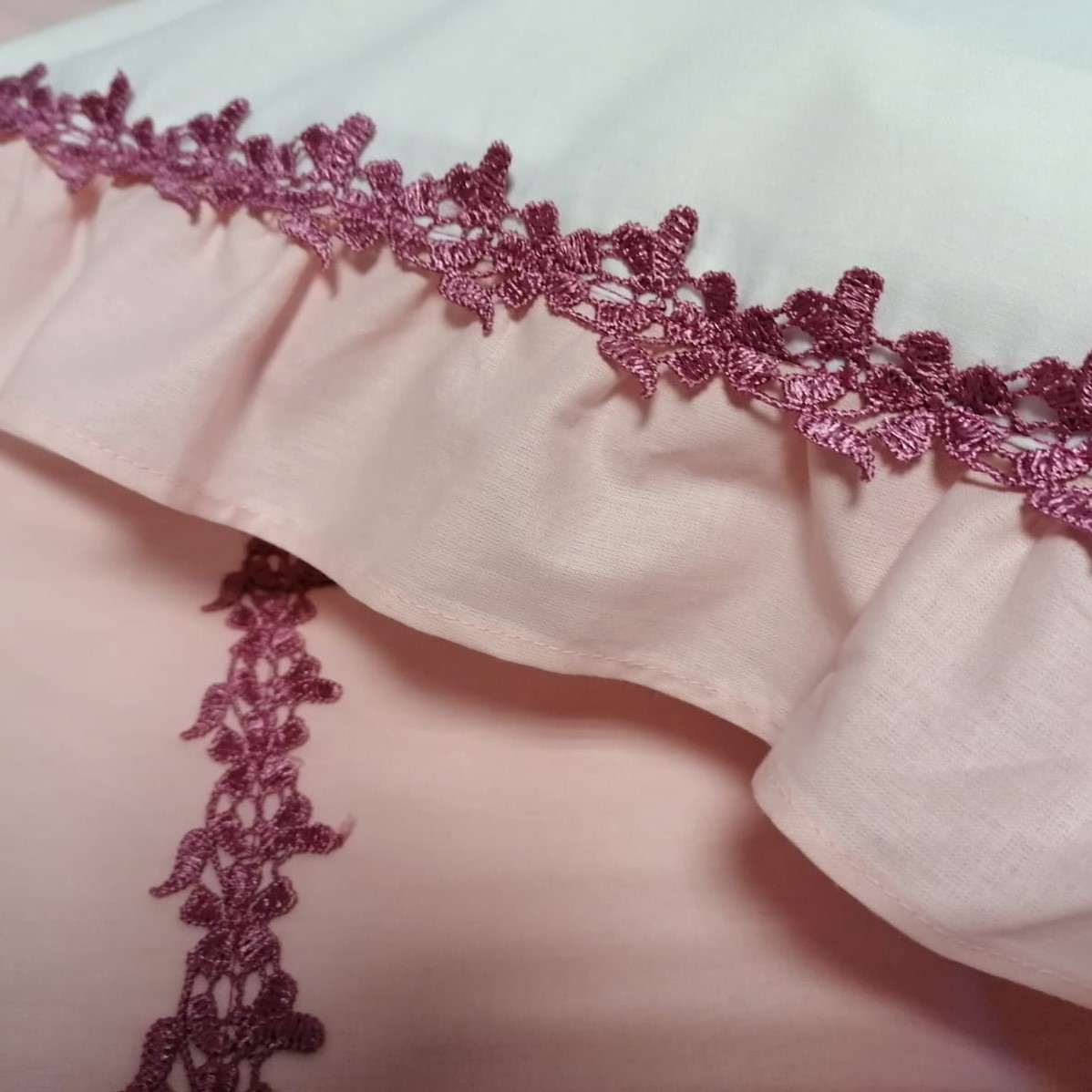 Fii primul care scrii o recenzie pentru „Set lenjerie pat super king Casa Bucuriei, 3 piese, dantela guipure roz vintage si volane, alb/roz, bumbac ranforce 100%, 1 x cearsaf pat 280/260 si 2 x husa perna 50/70”