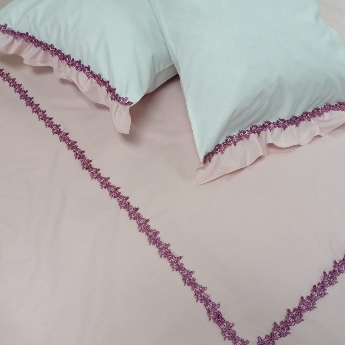 Set lenjerie pat super king Casa Bucuriei, 3 piese, dantela guipure roz vintage si volane, alb/roz, bumbac ranforce 100%, 1 x cearsaf pat 280/260 si 2 x husa perna 50/70