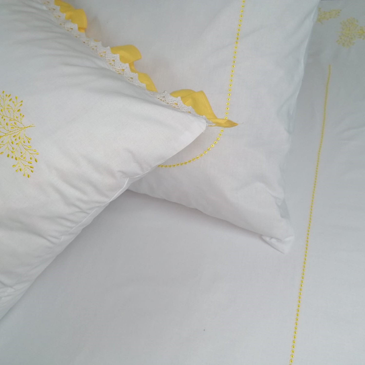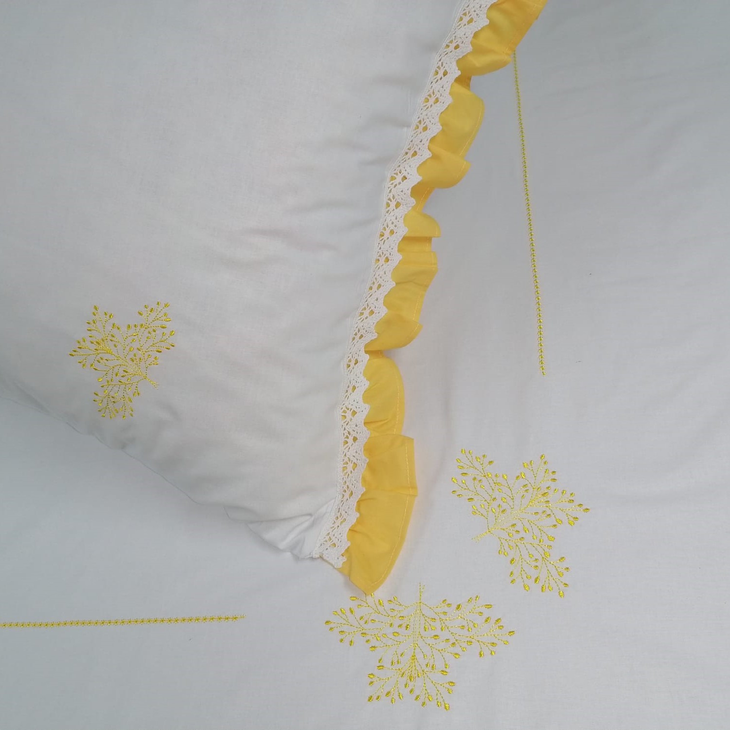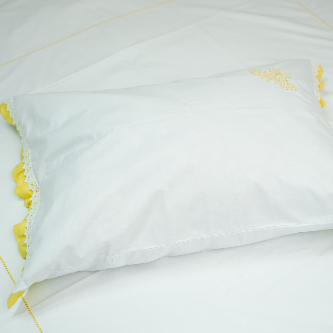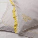 Set lenjerie pentru un pat superking, din bumbac satinat, cu broderie si volanase galbene. Inchidere cu nasturi ascunsi in partea inferioara.