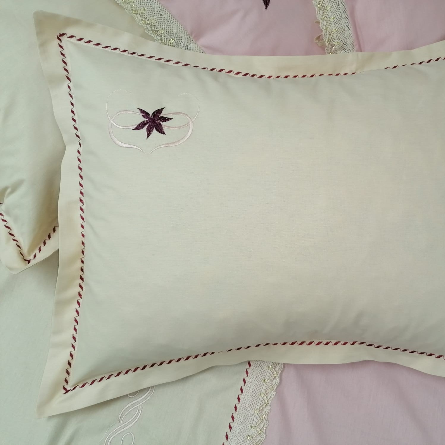 Set lenjerie pentru un pat dublu matrimonial, din bumbac satinat, cu broderie, detalii si finisaje decorative.