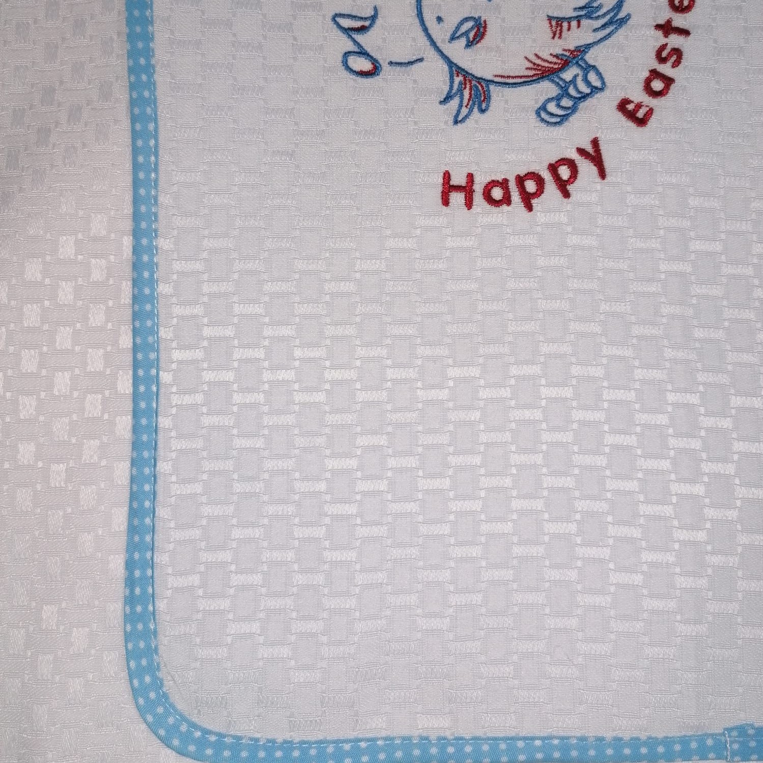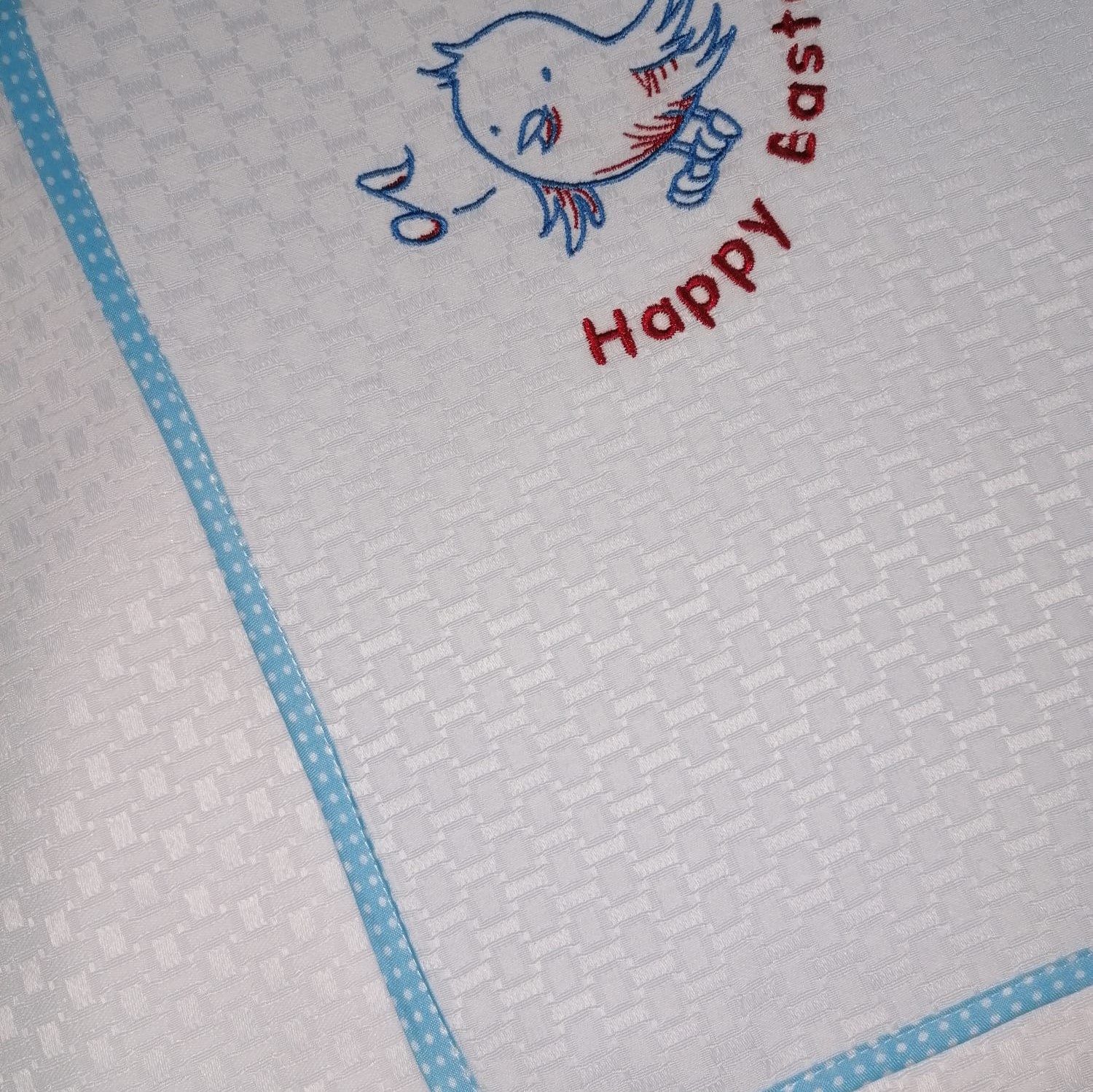 Suport farfurie Happy Easter este confectionata din material textil de calitate, bumbac si damasc, fiind astfel reziztenta la pete; are finisaj cu paspoal decorativ si broderie cu tematica pentru Sarbatorile Pascale pe o fata, cealalta fata fiind simpla pentru a fi folosit si in restul anului.