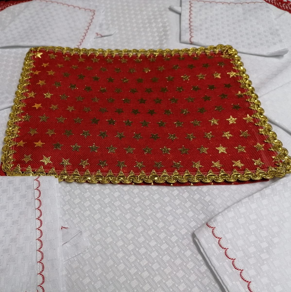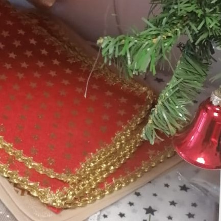 Traversa masa cu Stelute si bordura galon auriu este ideala pentru aranjamentele de iarna.